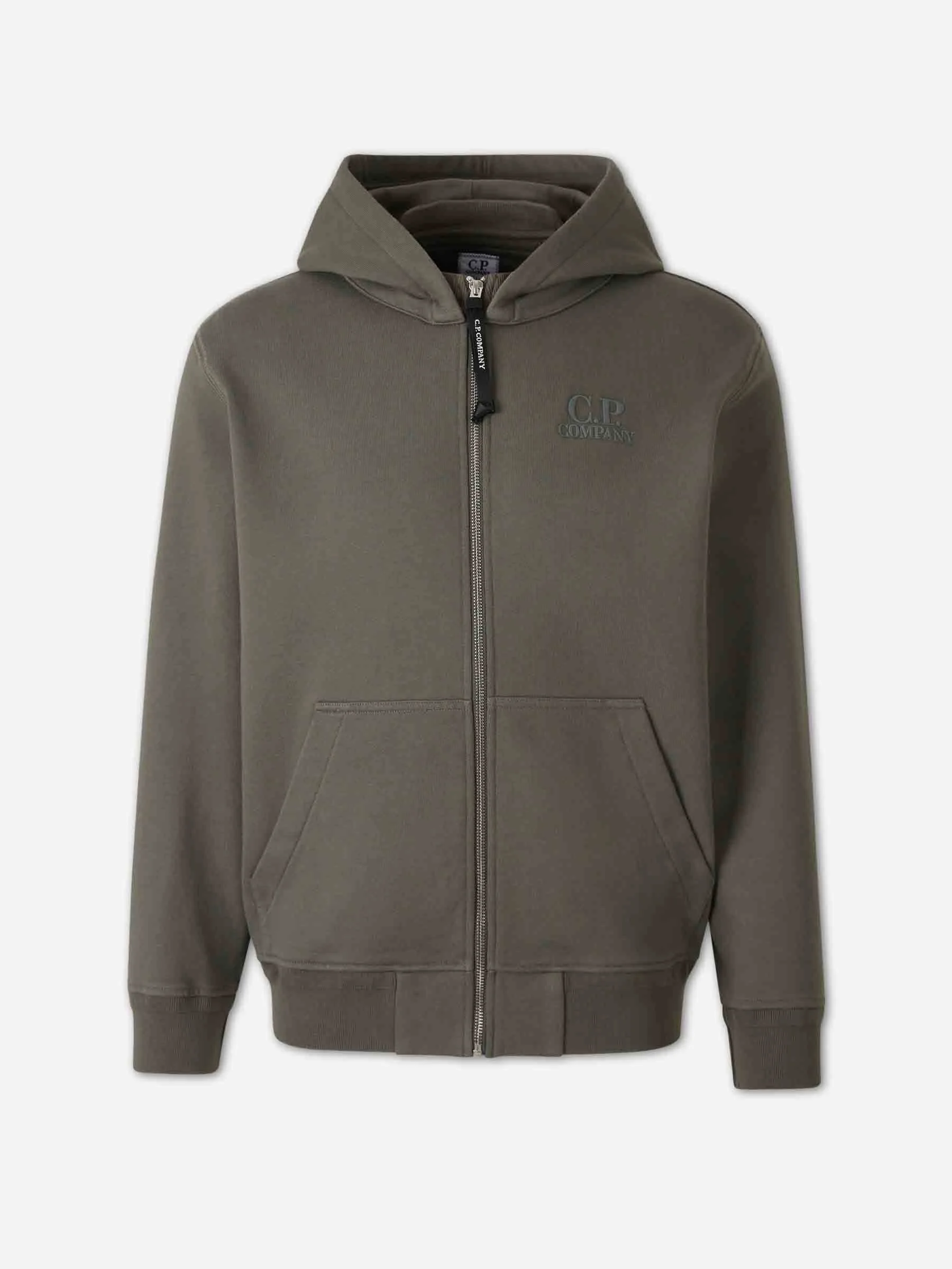 SKU: 545-002106 02 BRAND ID: 20CMSS025A-005086W sweatshirt By CP Company • Regular fit • Made of cotton terry cloth • Adjustable-cut hooded collar • Front zip closure • Ribbed cuffs and hem • Front kangaroo pocket • Composition: 100% cotton • Made in: Italy
