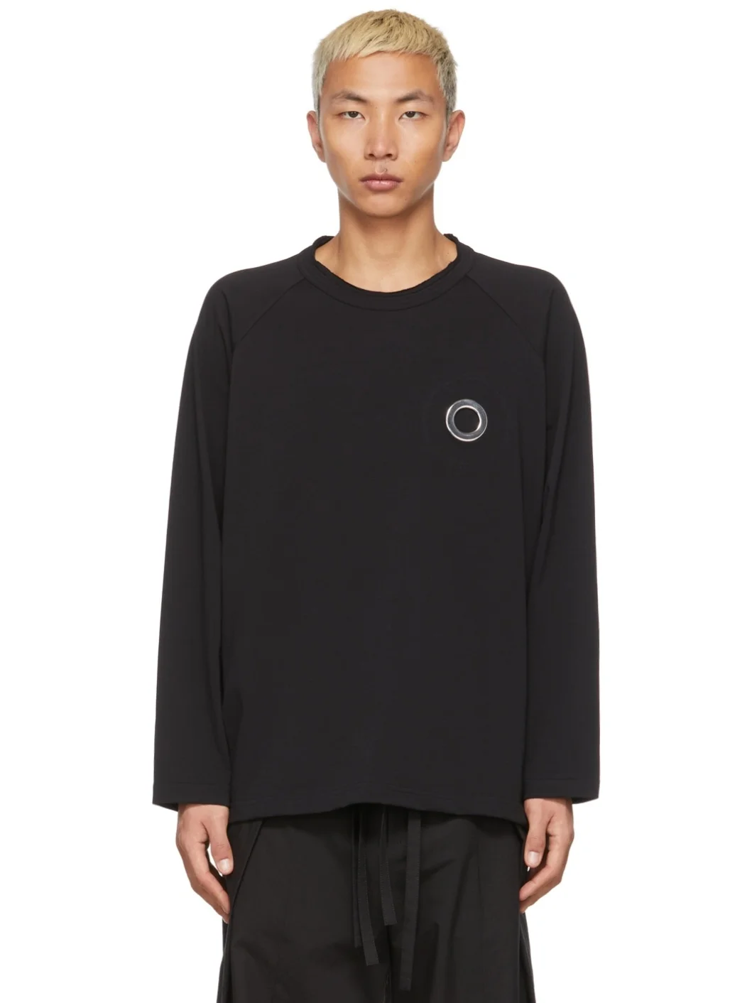 Long sleeve cotton jersey T-shirt in black featuring eyelets in silver-tone at chest. Raw edge at crewneck collar. Supplier color: Black 100% cotton. Made in Italy 221735M213005