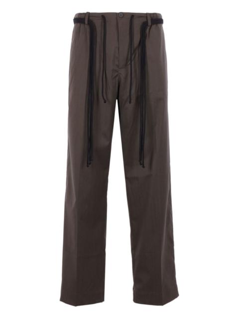 elasticized worker trousers Highlights - Black - Elasticated waistband - Drawstrings - Belt loops - Detachable self-tie belt - Three-pockets - Zip fly - Creased legs Imported Composition Wool 70%, Polyester 30% Washing instructions Read Manufacturer Guidelines