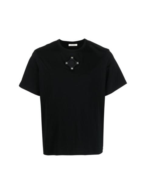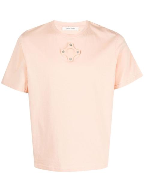 eyelet-detail short-sleeve T-shirt peach orange cotton metal eyelet detailing round neck short sleeves straight hem Imported Composition Cotton 100% SIZE & FIT Model measurements Height 6 ft 1 in(1.85 m) Bust/Chest 31.88 in(81 cm) Hips 33.07 in(84 cm) Waist 26.77 in(68 cm) Measurement CHEST 40.94 in(104 cm) LENGTH 24.4 in(62 cm) SLEEVE LENGTH 8.66 in(22 cm) Shoulder Width 17.32 in(44 cm) FittingInformation This piece fits true to size. We recommend you get your regular size Cut for a relaxed fit Made with a mid-weight fabric Washing instructions Hand Wash