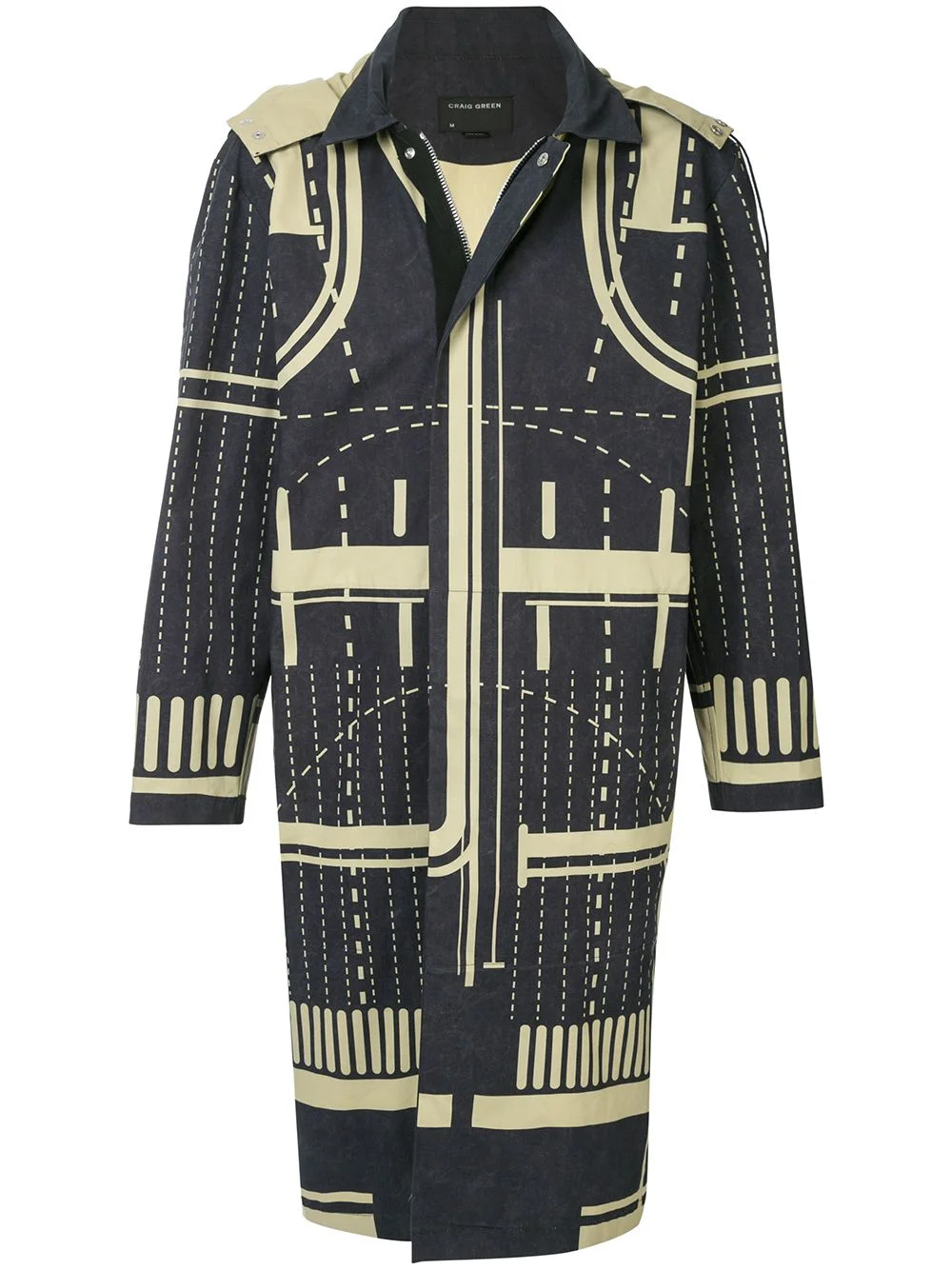 graphic pattern coat Black cotton graphic pattern coat from Craig Green featuring a classic collar, a concealed front fastening, a concealed front button placket, button fastenings at the shoulder and long sleeves. Made in Italy Composition Cotton 100% SIZE & FIT Model measurements Height 6 ft 2 in(1.88 m) Bust/Chest 38.18 in(97 cm) Hips 35.43 in(90 cm) Waist 29.92 in(76 cm) Washing instructions Hand Wash