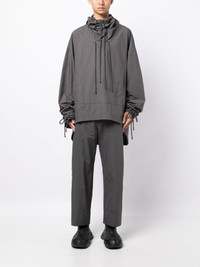 high-waist tailored trousers Highlights - Dark grey - High waist - Belt loops - Concealed front press-stud fastening - Two side slit pockets - Two rear welt pockets - Wide leg - Cropped leg - Straight hem Made in Italy Composition Body: Polyester 67%, Nylon 33% SIZE & FIT Model measurements Height 6 ft 2 in(1.87 m) Bust/Chest 31.49 in(80 cm) Hips 37.79 in(96 cm) Waist 27.95 in(71 cm) FittingInformation Designed for a straight-leg, allowing for an unrestricted and comfortable fit over the leg Cropped in length Made from a lightweight non-stretch fabric This piece fits large – take one size down Washing instructions Dry Clean Only