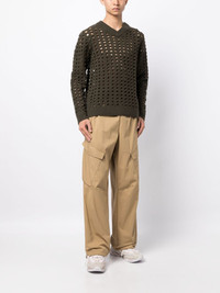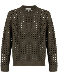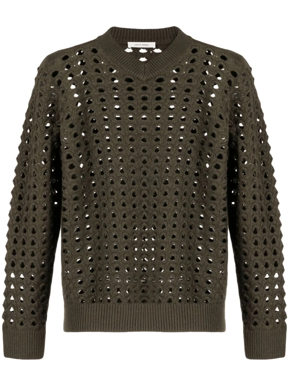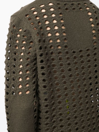 long-sleeve perforated sweatshirt Highlights - Olive green - Merino wool - Fully perforated - Ribbed v-neck - Long sleeves - Straight hem - Ribbed cuffs and hem Made in Italy Composition Body: Merino 100% SIZE & FIT Model measurements Height 6 ft 2 in(1.87 m) Bust/Chest 31.49 in(80 cm) Hips 37.79 in(96 cm) Waist 27.95 in(71 cm) FittingInformation Designed to be unstructured, offering a loose fit throughout Made with a midweight knit, this piece offers some stretch This piece fits true to size – take your usual size Washing instructions Hand Wash