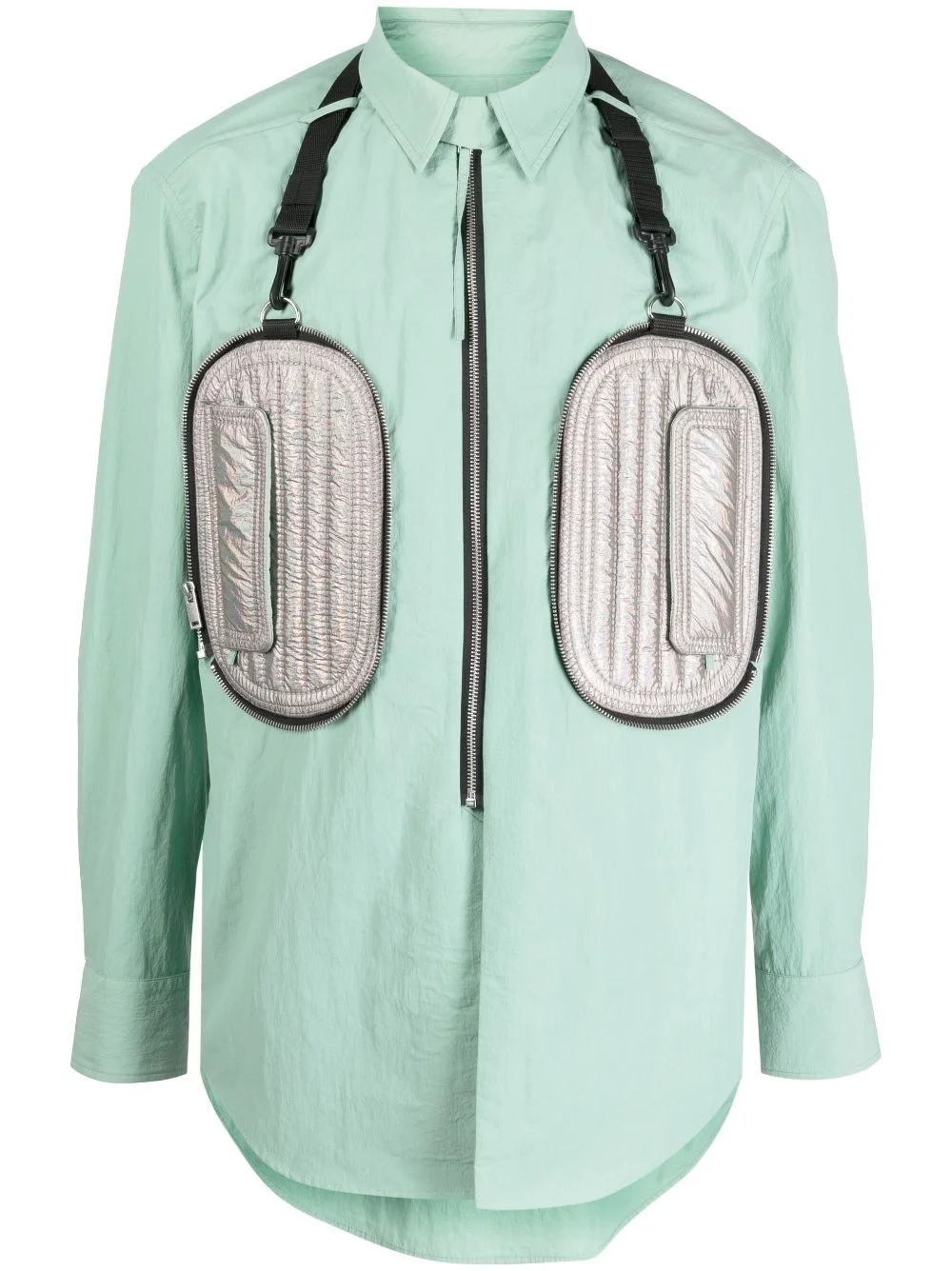 padded-pocket zip-up shirt Highlights - Mint green - Padded panels - Classic collar - Short front zip fastening - Two chest patch pockets - Long sleeves - Buttoned cuffs - Curved hem Imported Composition Body: Nylon 74%, Cotton 26% SIZE & FIT Model measurements Height 6 ft 2 in(1.87 m) Bust/Chest 36.22 in(92 cm) Hips 37.79 in(96 cm) Waist 28.34 in(72 cm) Measurement CHEST 43.3 in(110 cm) LENGTH 31.49 in(80 cm) WAIST 41.73 in(106 cm) SLEEVE LENGTH 25.19 in(64 cm) Shoulder Width 19.29 in(49 cm) FittingInformation Designed to be unstructured, offering a loose fit throughout Made from a midweight non-stretch fabric This piece fits true to size – take your usual size Washing instructions Machine Wash