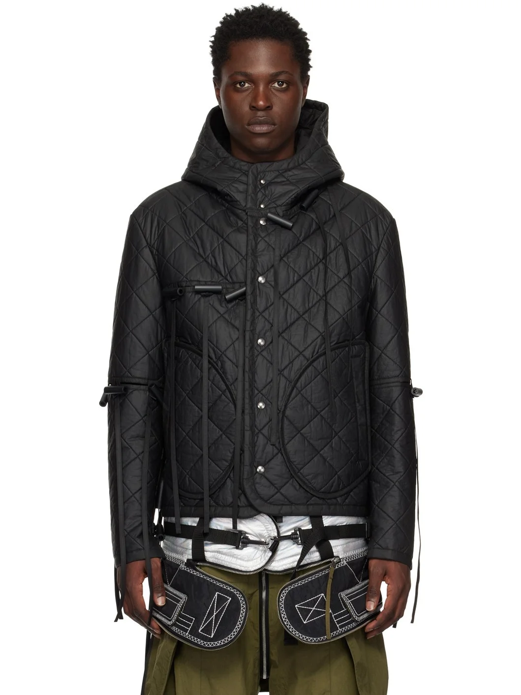 Quilted insulated polyester-blend satin jacket. Toggle fastenings throughout. · Detachable hood · Press-stud closure · Welt pockets · Patch pocket at interior Available exclusively at SSENSE. Supplier color: Black Body: 84% polyester, 16% polyurethane. Fill: 50% polyurethane, 50% polyethylene. Made in Italy 231735M180014