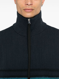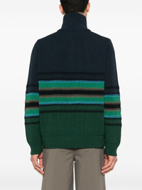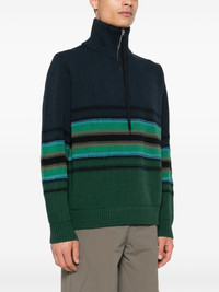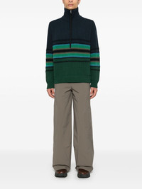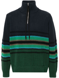 striped knitted sweater Highlights - Navy blue/green - Cotton blend - Knitted construction - Horizontal stripe pattern - High neck - Long sleeves - Ribbed cuffs and hem - Straight hem - Half front zip fastening Made in United Kingdom Composition Cotton 74%, Polyester 26% SIZE & FIT Model measurements Height 6 ft 1 in(1.85 m) Bust/Chest 35.82 in(91 cm) Hips 37.79 in(96 cm) Waist 29.13 in(74 cm) FittingInformation Designed for a regular fit, offering a comfortable loose fit throughout the body Made with a midweight knit, this piece offers some stretch This piece fits true to size – take your usual size