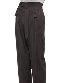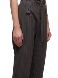 Craig Green utility trousers in gray, all-over vertical pinstripe pattern, elastic waistband, bar and hook closure, elongated belt loops, zippered fly, slash hand pockets, rear pockets, straight/finished hem, tonal stitching. Made in Italy. Composition - 100% Cotton Model is 6ft 2” and wearing a size 3. Shoulders: 18” Chest: 31” Waist: 27”