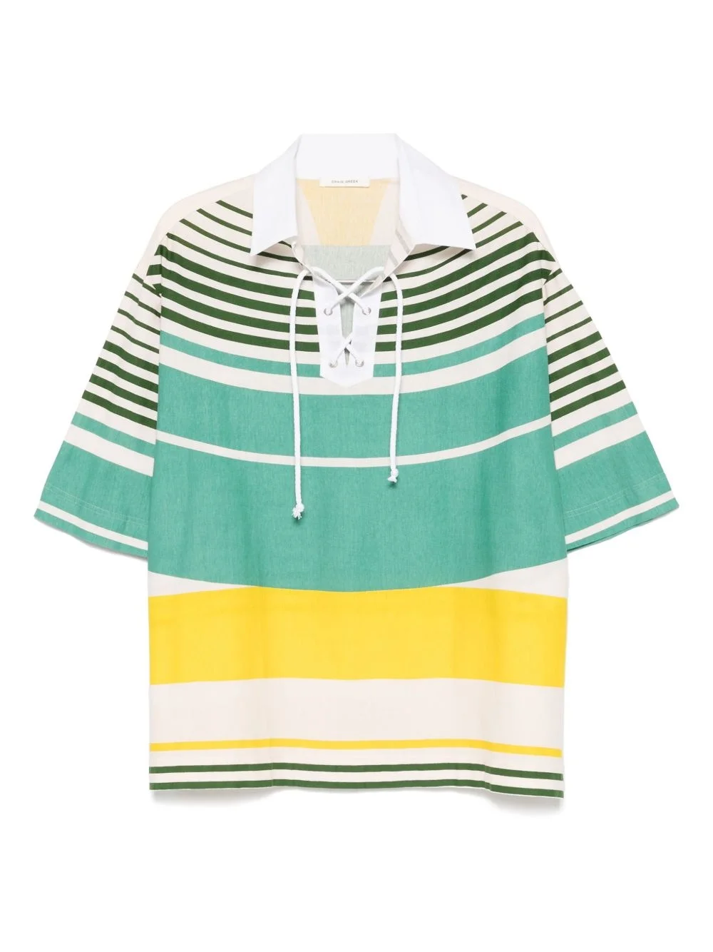 Wave polo shirt Highlights - Light beige - Front lace-up fastening - Short side slits - Horizontal stripe pattern - Short sleeves Imported Composition Cotton 100% SIZE & FIT Model measurements Height 6 ft 2 in(1.87 m) Bust/Chest 36.41 in(92.5 cm) Hips 37 in(94 cm) Waist 29.52 in(75 cm) FittingInformation Designed for a loose fit, this polo shirt offers additional room throughout Made from a midweight non-stretch fabric, this piece offers minimal elasticity when worn
