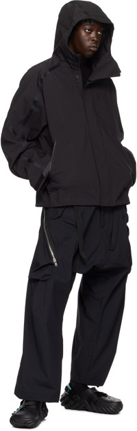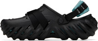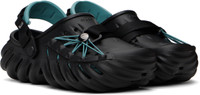 Croslite™ foam rubber slip-on sandals in black and blue. · Reflective detailing and cutouts throughout · Perforations and logo embossed at vamp · Elasticized drawstrings and webbing strap at vamp · Logo patch at convertible slingback strap · Molded rubber footbed · Treaded rubber sole · Logo-engraved hardware Supplier color: Black Upper: rubber. Sole: rubber. Made in Viet Nam 242209M234001