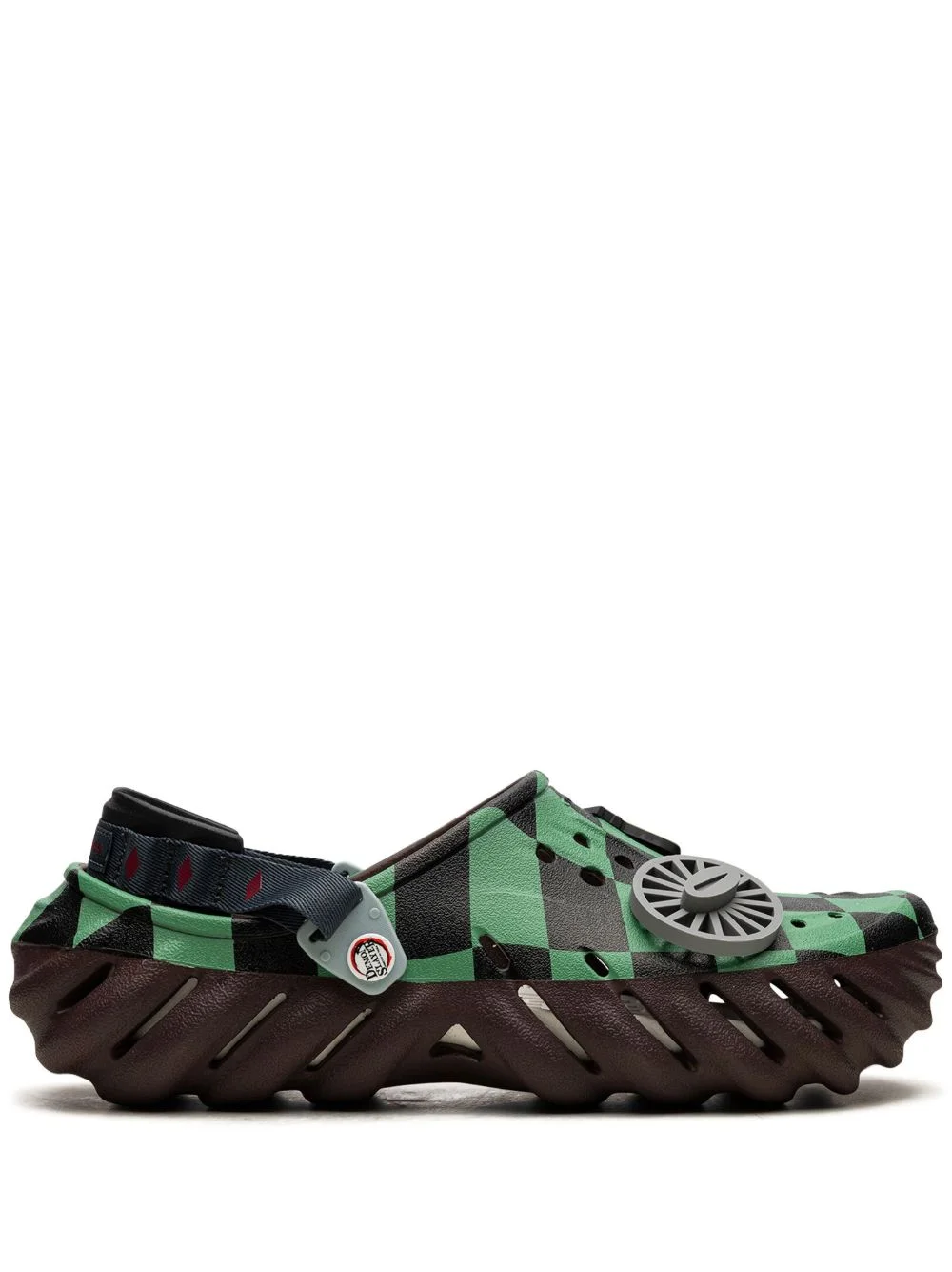 Echo "Demon Slayer - Tanjiro" Clogs Salehe Bembury x Crocs collaborate on a ‘utilitarian exploration of form and function’, as demonstrated with these Echo "Demon Slayer - Tanjiro" clogs. They’re rendered in a black and green checkerboard design and grounded atop a concave ridged sole with multi-directional traction. Highlights - Black/green - Embossed logo to the front - Applique detail - Checkerboard print - Cut-out detailing - Moulded footbed - Ankle touch-strap fastening - Rubber sole - Round toe - These styles are supplied by a premium sneaker marketplace. stocking only the most sought-after footwear, they source and curate some of the most hard to find sneakers from around the world. Imported Composition Sole: Rubber 100% Lining: Rubber 100% Outer: PVC 100%