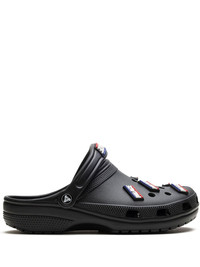 x Palace Classic clogs These Palace Skateboards x Crocs Classic clogs boast a sleek and simple black design. The Palace logo is prominently displayed on the strap and footbed, while a range of custom Jibbitz charms decorate the top. Highlights - Black - Signature tri-ferg logo - Applique detailing - Cut-out detailing - Round toe - Slingback strap - Rubber sole Imported Composition Sole: Rubber 100% Lining: Polyethylene vinyl acetate (PEVA) 100% Outer: Polyethylene vinyl acetate (PEVA) 100%