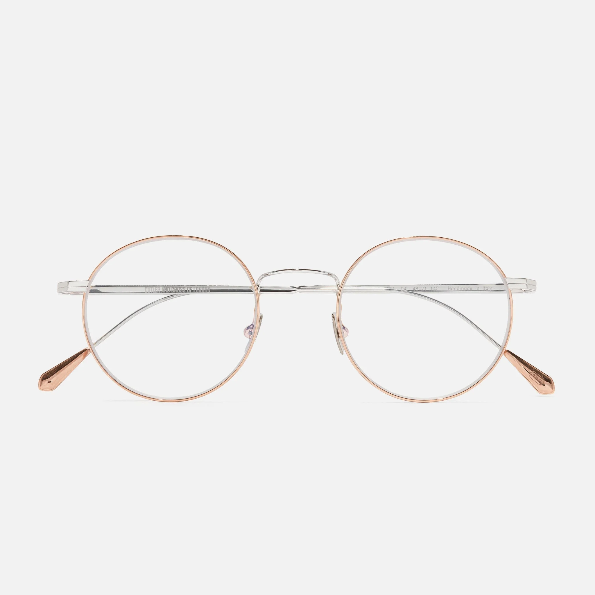 With lightness and functionality as its core, the AUOP 0001 is a contemporary and easy-wearing metal pantos. An inspired renewal of our original 1990s model 0306, this frame allows for uncompromising fit and comfort alongside sharp stylistic features. Available plated in either 18K White Gold, Rhodium, 18K Gold, 18K Rose Gold, or a combination of precious metals Rose Gold 18K + Rhodium 18K. Details - Handcrafted in Italy by expert craftspeople, read more about our craftsmanship story - New Temple Tip inscribed with 'Aurum' - Hypoallergenic Nosepads - Galvanised Precious Metal Finish - Need help? Read our full Glossary of Terms Size & Fit SKU: AUOP-0001-48-04 Frame shape: Round Lens width (mm): 48 Temple length (mm): 145 Bridge width (mm): 21