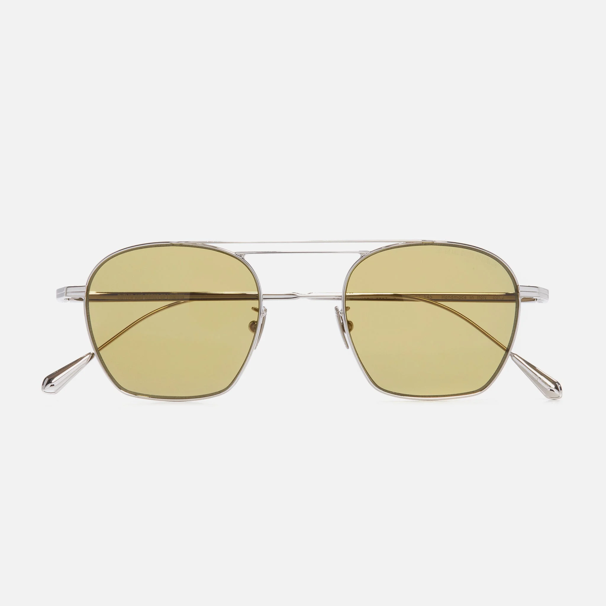 The 0004 sunglass presents a subtle update on the classic navigator frame, sculpted with octagonal edges and a double browline. It's handcrafted in Italy from polished precious metals to an ultra-light design. Available in 18K White Gold Rhodium, 18K Gold,18K Rose Gold, and a combination of 24K Yellow Gold and 18K Rhodium. Details - Handcrafted in Italy by expert craftspeople, read more about our craftsmanship story - Double-curved nose bridge - Adjustable nose pads - Engraved logo inside temple - Need help? Read our full Glossary of Terms Size & Fit SKU: AUSN-0004-48-01 Frame shape: Aviator Temple length (mm): 145 Lens width (mm): 48 Bridge width (mm): 22