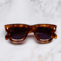 The 1402 is a bold square frame which references silhouettes from our own 1980s archive, milled from 10mm thick acetate but with an undersized construction to give this retro looking style a modern edge. This frame represents the past and the future of Cutler and Gross. Details - Handcrafted in Italy by expert craftspeople, read more about our craftsmanship story - Hazard Core Wire - New Minimal Temple - Triple Compass Riveted Temples - Oyster Pins - Need help? Read our full Glossary of Terms Size & Fit SKU: CGSN-1402-50-02 Frame shape: Square Frontal width (mm): 156 Temple length (mm): 155 Lens width (mm): 50 Bridge width (mm): 23