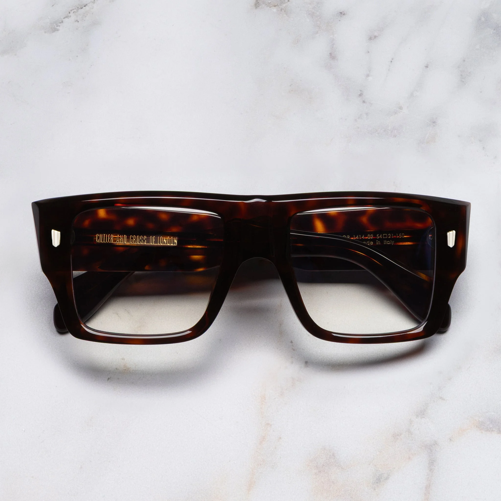 Architectural and artisanal, the 1414 is handcrafted to an oversized square with a flat top and pressed nose bump. It is structured with Modernist core wire and lightened with milled edges. Details - Oyster frontal pins - Compass Star temple pins - 7-barrel hinges - Fender temples - Modernist core wire - Gold-foil logo on inner temple - Handcrafted in Italy by expert craftspeople, read more about our craftsmanship story - Need help? Read our full Glossary of Terms Size & Fit SKU: CGOP-1414-54-02 Frame shape: Rectangle Lens width (mm): 54 Temple length (mm): 150 Bridge width (mm): 21