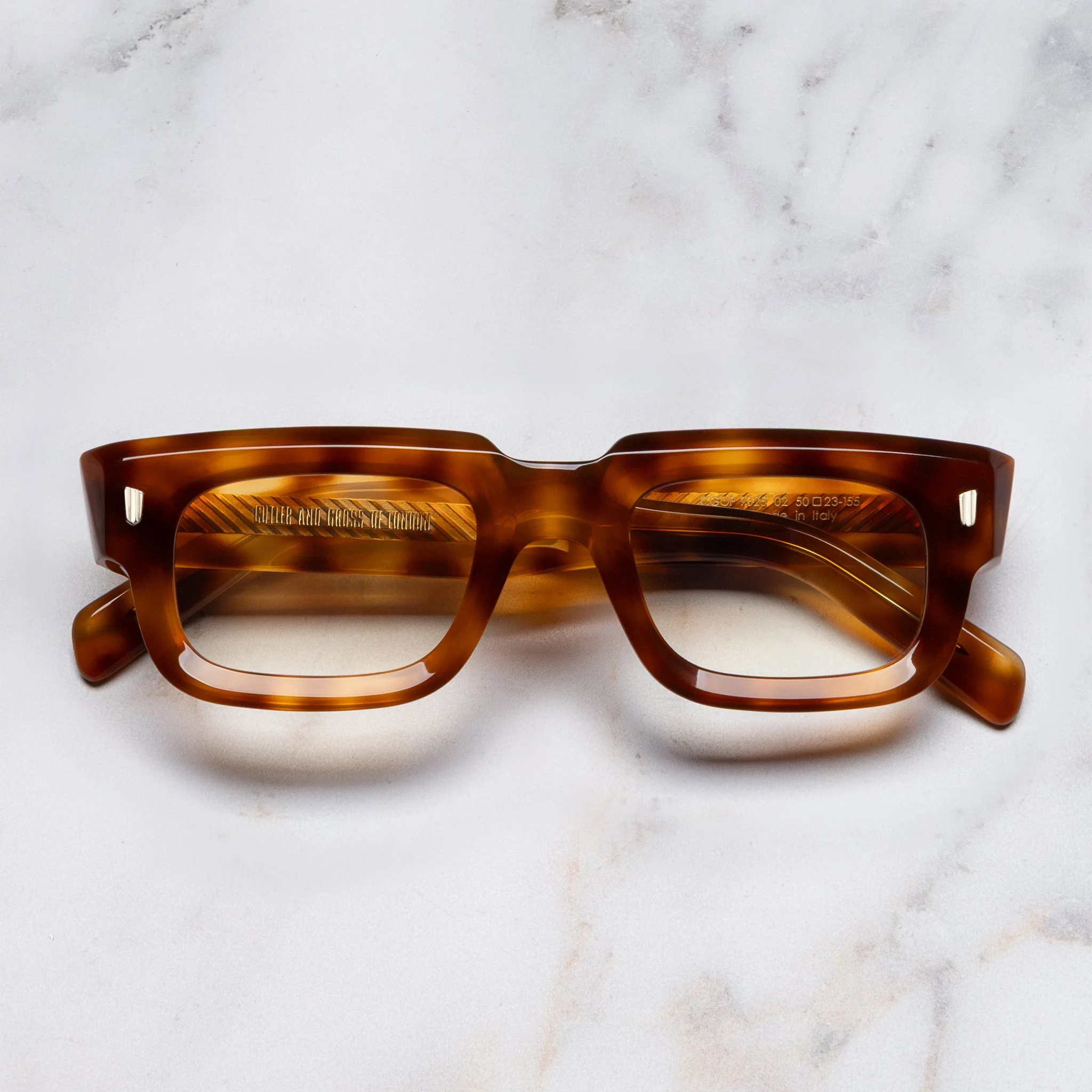 Borrowing its silhouette from our classic 325 from the early 1990s, the 9325 uses this shape and takes it further and bolder still. Handcrafted from 10 mm acetate with thicker temples and prominent frontals, this striking frame is milled internally to reduce weight without losing any of its visual impact. Details - Handcrafted in Italy by expert craftspeople, read more about our craftsmanship story - Hazard Core Wire - Triple Compass Riveted Temples - Oyster Pins - New Minimal Temple - Need help? Read our full Glossary of Terms Size & Fit SKU: CGOP-9325-50-02 Frame shape: Rectangle Frontal width (mm): 153 Lens width (mm): 50 Temple length (mm): 155 Bridge width (mm): 23