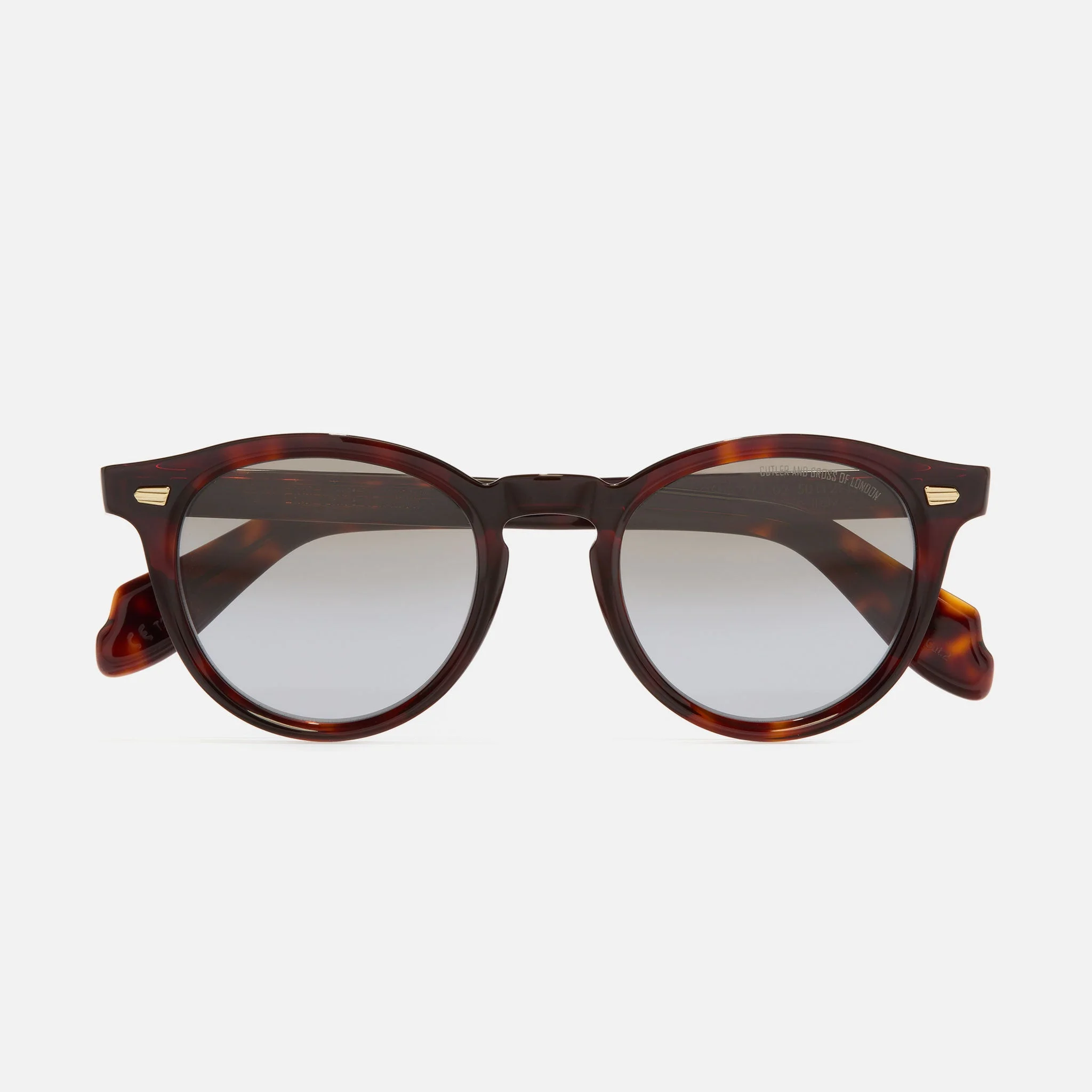 This round sunglass takes its cue from the classic Pantos frames made in our original workshop in the early 1970s. It is handcrafted over 262 hours with a keyhole bridge and curved browline that culminates in slender temples. High hinges lend a hint of cat-eye edge to the rounded shape. A limited production of 500 frames. Details - 100% UVA and UVB lenses - Keyhole bridge - Oyster frontal pins - Compass Star temple pins - 5-barrel hinges - Fender temples - Deco core wire - Logo engraved on inner temple - Handcrafted in Italy by expert craftspeople, read more about our craftsmanship story Size & Fit SKU: CGSN-9378-50-02 Frame shape: Round Frontal width (mm): 145 Temple length (mm): 150 Lens width (mm): 50 Bridge width (mm): 21