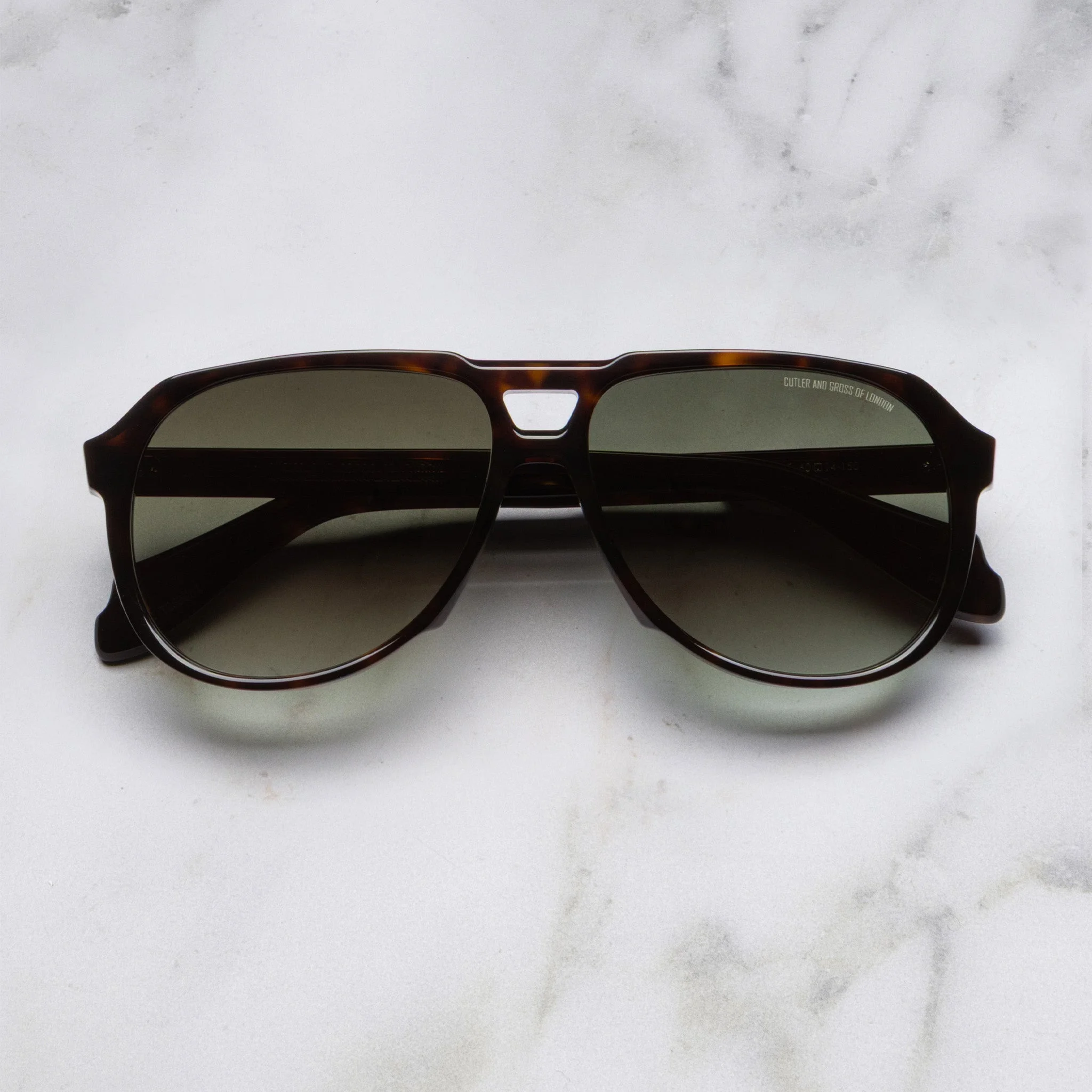 The 9782 aviator sunglasses pay tribute to the hedonism and happenings of the late 80s and 90s, when Cutler and Gross customers like Iggy Pop and Grace Jones frequented Studio 54. It's rooted in our bestselling 1394 frame, reworked with a slightly narrower bridge and classic teardrop lenses. Compass Star pins and Art Deco core wire add subtle yet distinctive detail. Details - 100% UVA and UVB lenses - 5-barrel hinges - Compass Star temple pins - Art Deco core wire - Gold-foil logo inside temple - Fender temple tips - Handcrafted in Italy - SKU: CGSN-9782-60 Size & Fit Size: Large Frame width: 150 mm Temple length: 150 mm Lens width: 60 mm Bridge width: 14 mm Bridge fit: Medium Size Guide. Find your size and fit. Face shape: Round, oval, square, heart. Discover the Face Shape Guide.