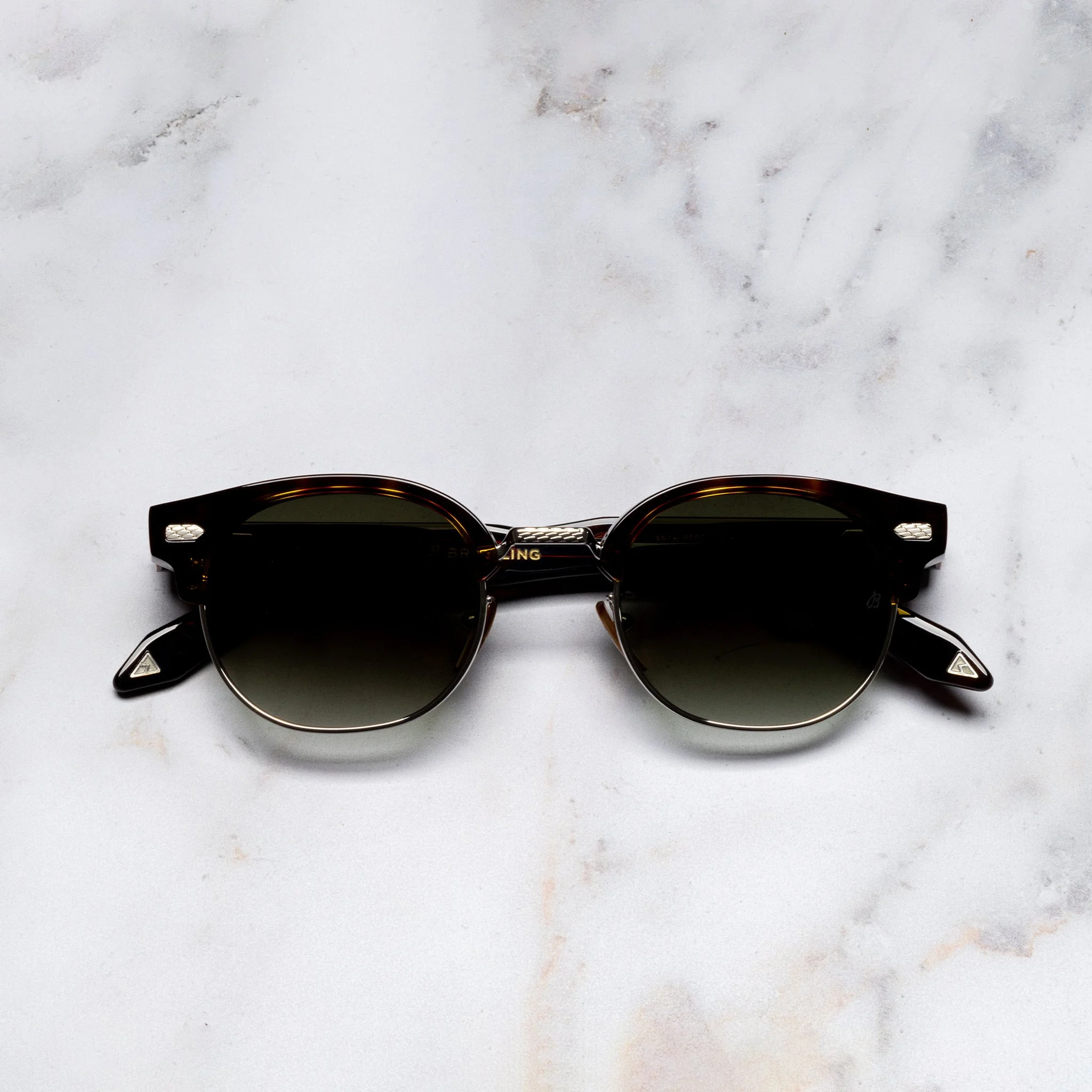 The boldness of the browline and depth of the metalwork lend gravitas to the 0003 sunglass. Created in collaboration with Breitling, the vintage-inspired frame is handcrafted from eco-conscious cellulose acetate to a layered design that exposes the metal components beneath. Details - Breitling Eyewear Collaboration - 100% UVA and UVB lenses - Adjustable nose pads - Luminous arrowhead on inner temples - Superocean Heritage core wire - Gold-foil logo on inner temples - Handcrafted from cellulose acetate - SKU: BRSN-0003-49 Size & Fit Size: Narrow Frame width: 140 mm Temple length: 150 mm Lens width: 49 mm Bridge width: 23 mm Bridge fit: Medium Size Guide. Find your size and fit. Face shape: Oval, square, heart Discover the Face Shape Guide.