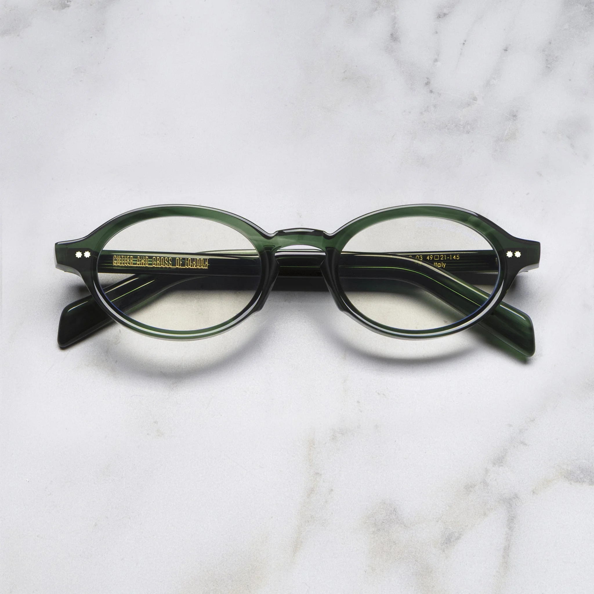 The undulating brow line and oval style of the GR13 offers a distinguished and balanced finish. Crafted from 8mm milled acetate for comfort, the style was guided by frames from founder Graham Cutler’s collection designed for smaller, and slighter proportions. Details - 8mm acetate - Signature 3D milling and bevelling - Keyhole nose bridge - 8-Star Compass frontal and temple pins - 5-Barrel hinges - Deco core wire - Gold-foil logo on inner temple - Reimagined archival temples - Handcrafted in Italy - SKU: CGOP-GR13-49 Size & Fit Size: Narrow Frame width: 140 mm Temple length: 145 mm Lens width: 49 mm Bridge width: 21 mm Bridge fit: Medium Size Guide. Find your size and fit. Face shape: Oval, square, heart Discover the Face Shape Guide.