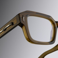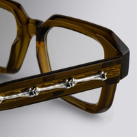 The Great Frog's rock'n'roll jewellery meets Cutler and Gross's acetate artistry with these square glasses. Hand cast in Sterling Silver, Bones Link and Dagger emblems gild the temples and frontal. The clean-cut shape is reverse-milled and threaded with Lock Down chain core wire. Details - The Great Frog Collection - Hand cast Sterling Silver Dagger frontal pins - 7-barrel hinges - Hand cast Sterling Silver Bones Link temple pins - Custom Lock Down chain core wire - Gold-foil logo on inner temple - Plectrum temple tips - Handcrafted in Italy - SKU: GFOP-005-52