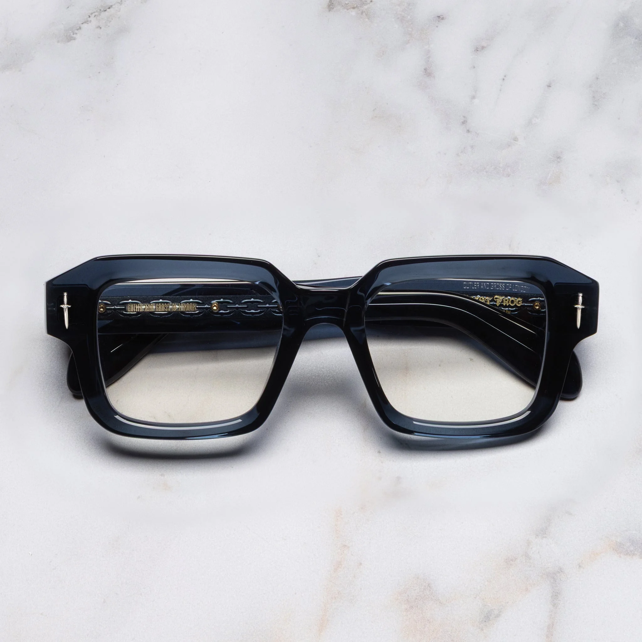 The Great Frog's rock'n'roll jewellery meets Cutler and Gross's acetate artistry with these square glasses. Hand cast in Sterling Silver, Bones Link and Dagger emblems gild the temples and frontal. The clean-cut shape is reverse-milled and threaded with Lock Down chain core wire. Details - The Great Frog Collection - Hand cast Sterling Silver Dagger frontal pins - 7-barrel hinges - Hand cast Sterling Silver Bones Link temple pins - Custom Lock Down chain core wire - Gold-foil logo inside temple - Plectrum temple tips - Handcrafted in Italy by expert craftspeople, read more about our craftsmanship story Size & Fit SKU: GFOP-005-52-03 Frame shape: Square Lens width (mm): 52 Temple length (mm): 150 Bridge width (mm): 20