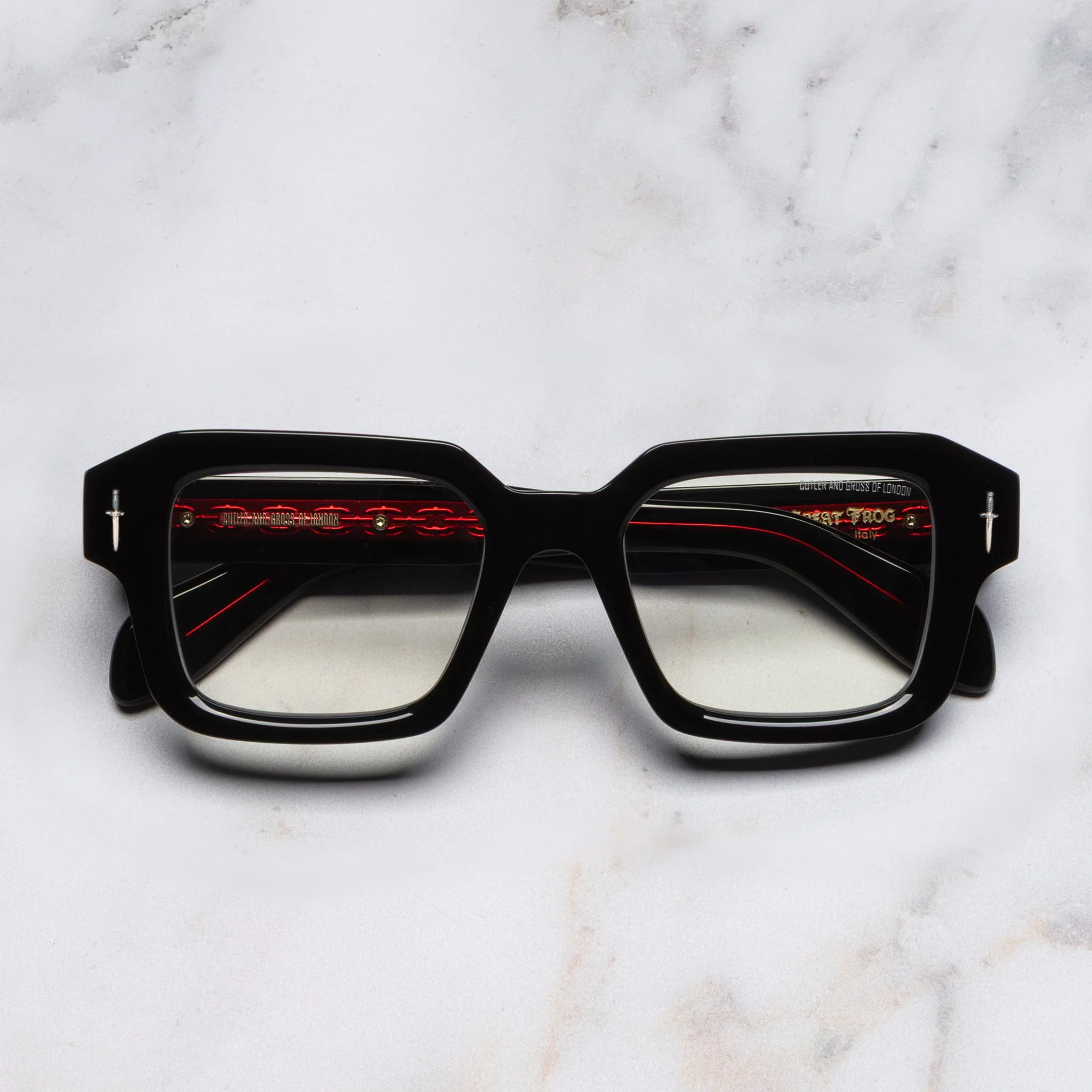 The Great Frog's rock'n'roll jewellery meets Cutler and Gross's acetate artistry with these square glasses. Hand cast in Sterling Silver, Bones Link and Dagger emblems gild the temples and frontal. The clean-cut shape is reverse-milled and threaded with Lock Down chain core wire. Details - The Great Frog Collection - Hand cast Sterling Silver Dagger frontal pins - 7-barrel hinges - Hand cast Sterling Silver Bones Link temple pins - Custom Lock Down chain core wire - Gold-foil logo inside temple - Plectrum temple tips - Handcrafted in Italy by expert craftspeople, read more about our craftsmanship story Size & Fit SKU: GFOP-005-52-01 Frame shape: Square Lens width (mm): 52 Temple length (mm): 150 Bridge width (mm): 20