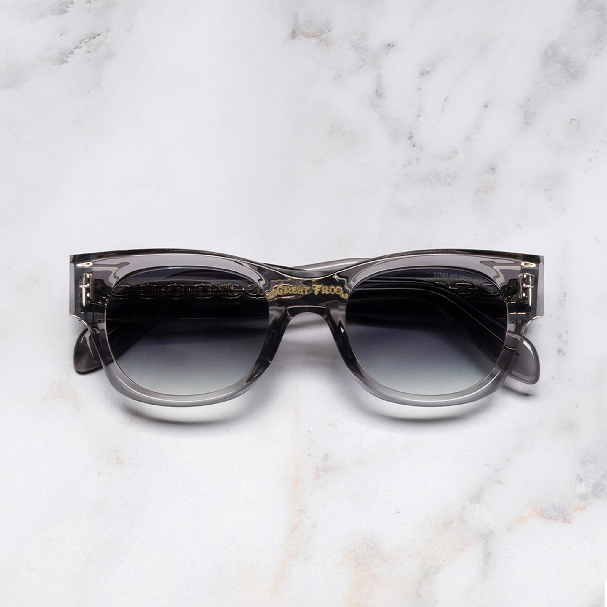 The classic American wayfarer takes a darker turn with this sunglass, created in collaboration with The Great Frog. The brand's gothic jewellery has been translated into solid Sterling Silver Dagger and Lock Down Chain emblems gilding the frame. Secured with hex screws, the chunky temples unfold to reveal The Great Frog's logo beneath. A limited production of 250 frames. Details - The Great Frog Collection - 100% UVA and UVB lenses - Solid Sterling Silver metalwork - Dagger frontal pins - Lock Down Chain trim at temples - Hex screws - Plectrum temples - Lock Down Chain core wire - Gold-foil logo on inner temples - Handcrafted in Italy by expert craftspeople, read more about our craftsmanship story Size & Fit SKU: GFSN-021-51-03 Frame shape: Square Frontal width (mm): 145 Temple length (mm): 150 Lens width (mm): 51 Bridge width (mm): 22