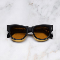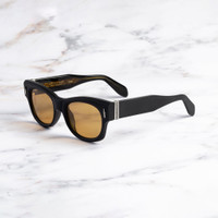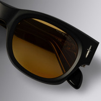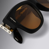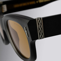 The classic American wayfarer takes a darker turn with this sunglass, created in collaboration with The Great Frog. The brand's gothic jewellery has been translated into solid Sterling Silver Dagger and Lock Down Chain emblems gilding the frame. Secured with hex screws, the chunky temples unfold to reveal The Great Frog's logo beneath. A limited production of 250 frames. Details - The Great Frog Collection - 100% UVA and UVB lenses - Solid Sterling Silver metalwork - Dagger frontal pins - Lock Down Chain trim at temples - Hex screws - Plectrum temples - Lock Down Chain core wire - Gold-foil logo on inner temples - Handcrafted in Italy by expert craftspeople, read more about our craftsmanship story Size & Fit SKU: GFSN-021-51-01 Frame shape: Square Frontal width (mm): 145 Temple length (mm): 150 Lens width (mm): 51 Bridge width (mm): 22