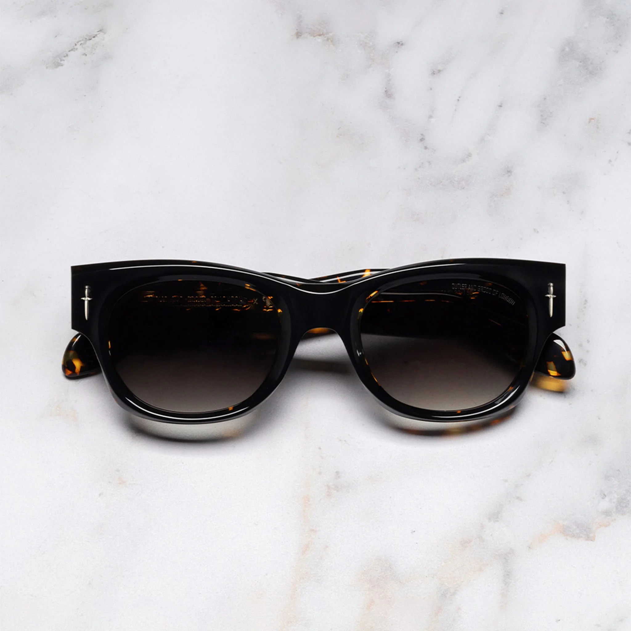 The classic American wayfarer takes a darker turn with this sunglass, created in collaboration with The Great Frog. The brand's gothic jewellery has been translated into solid Sterling Silver Dagger and Lock Down Chain emblems gilding the frame. Secured with hex screws, the chunky temples unfold to reveal The Great Frog's logo beneath. A limited production of 250 frames. Details - The Great Frog Collection - 100% UVA and UVB lenses - Solid Sterling Silver metalwork - Dagger frontal pins - Lock Down Chain trim at temples - Hex screws - Plectrum temples - Lock Down Chain core wire - Gold-foil logo on inner temples - Handcrafted in Italy by expert craftspeople, read more about our craftsmanship story Size & Fit SKU: GFSN-021-51-02 Frame shape: Square Frontal width (mm): 145 Temple length (mm): 150 Lens width (mm): 51 Bridge width (mm): 22