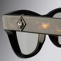 The Great Frog's iconoclastic spirit shapes the metalwork on this optical: Sterling Silver daggers stud the frontal while a new Flaming Heart pin gilds the temples. Bevelling adds sculptural detail to the frame, which is handmade by the Cutler and Gross artisans in Italy. A limited production of 250 frames. Details - The Great Frog Collection - Solid Sterling Silver metalwork - Dagger frontal pins - Flaming Heart temple pins - Plectrum temples - Lock Down Chain core wire - Gold-foil logo on inner temples - Handcrafted in Italy by expert craftspeople, read more about our craftsmanship story Size & Fit SKU: GFOP-022-51-02 Frame shape: Square Frontal width (mm): 145 Lens width (mm): 51 Temple length (mm): 150 Bridge width (mm): 22