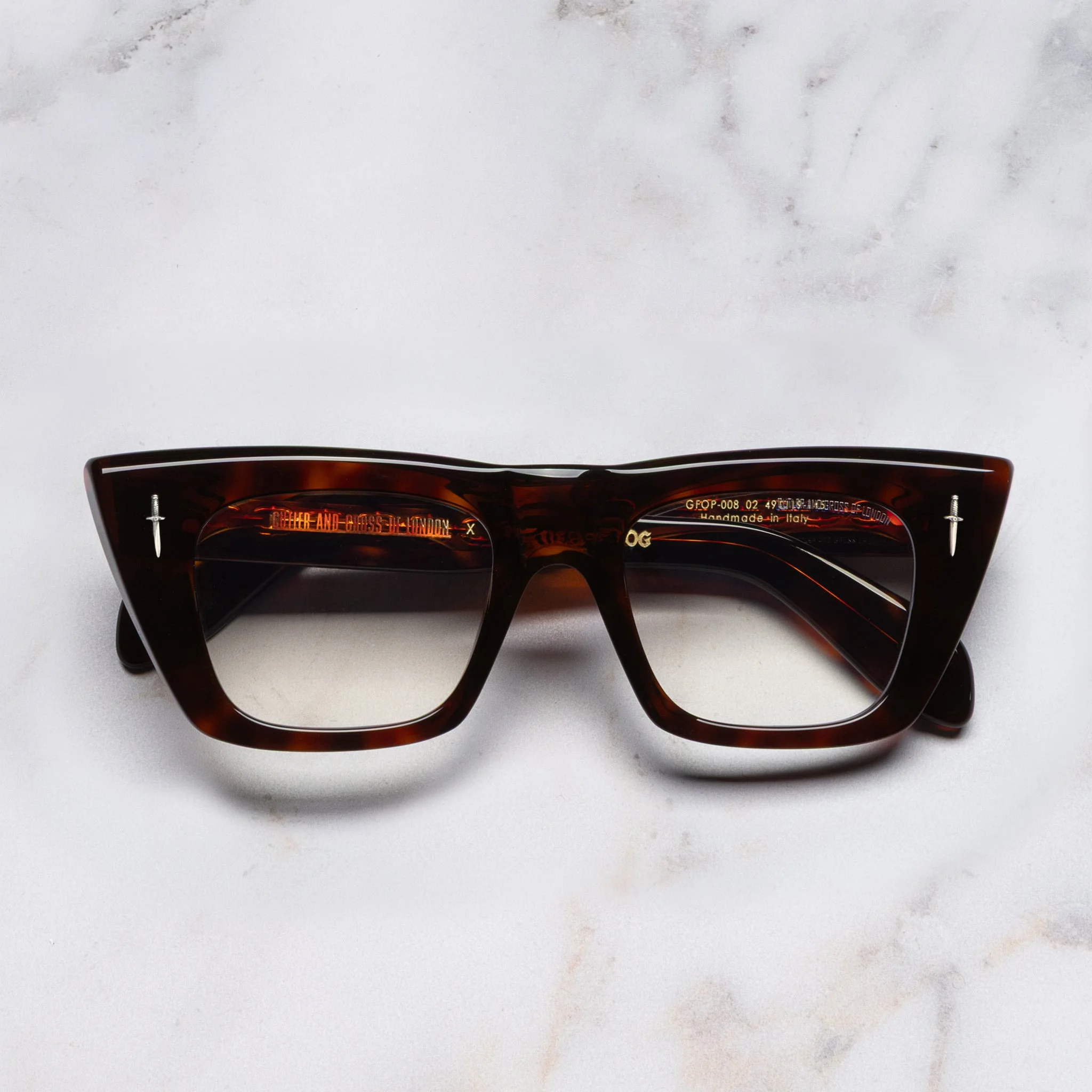 Cat-eye glasses have been brought willingly into disrepute with the Cutler and Gross X The Great Frog collaboration. Intricately hand cast from Sterling Silver, Dagger frontal pins accent the 80s-inspired frame, while Lock Down chain core wire threads through the temples. They're shaped with a gender-bending flat top and finished with chunky Plectrum tips. Details - Handcrafted in Italy by expert craftspeople, read more about our craftsmanship story - The Great Frog Collection - Hand cast Sterling Silver Dagger frontal pins - 5-barrel hinges - Big Eye rivets - Custom Lock Down chain core wire - Gold-foil logo inside temple - Plectrum temple tips - Need help? Read our full Glossary of Terms Size & Fit SKU: GFOP-008-49-02 Frame shape: Cat-Eye Lens width (mm): 49 Temple length (mm): 145 Bridge width (mm): 19