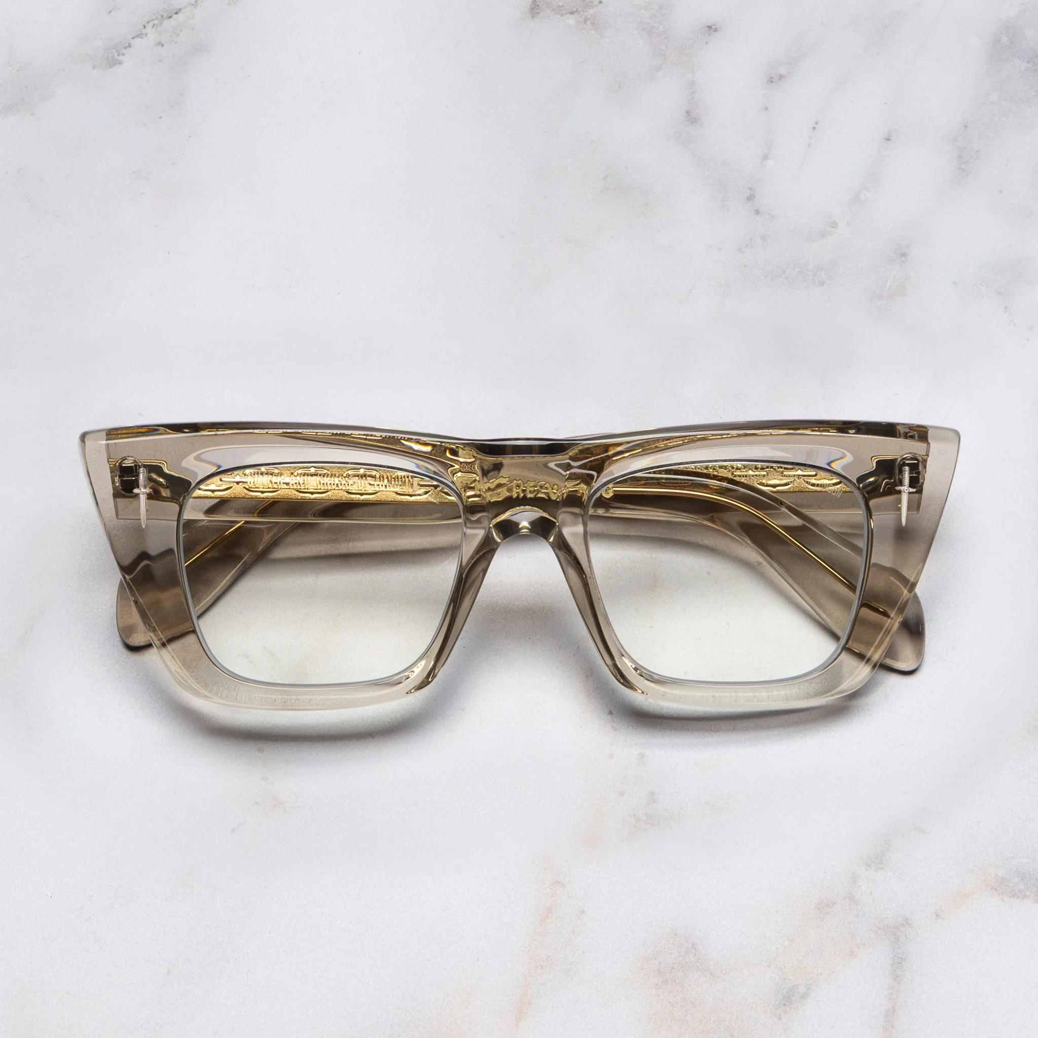 Cat-eye glasses have been brought willingly into disrepute with the Cutler and Gross X The Great Frog collaboration. Intricately hand cast from Sterling Silver, Dagger frontal pins accent the 80s-inspired frame, while Lock Down chain core wire threads through the temples. They're shaped with a gender-bending flat top and finished with chunky Plectrum tips. Details - Handcrafted in Italy by expert craftspeople, read more about our craftsmanship story - The Great Frog Collection - Hand cast Sterling Silver Dagger frontal pins - 5-barrel hinges - Big Eye rivets - Custom Lock Down chain core wire - Gold-foil logo inside temple - Plectrum temple tips - Need help? Read our full Glossary of Terms Size & Fit SKU: GFOP-008-49-04 Frame shape: Cat-Eye Lens width (mm): 49 Temple length (mm): 145 Bridge width (mm): 19