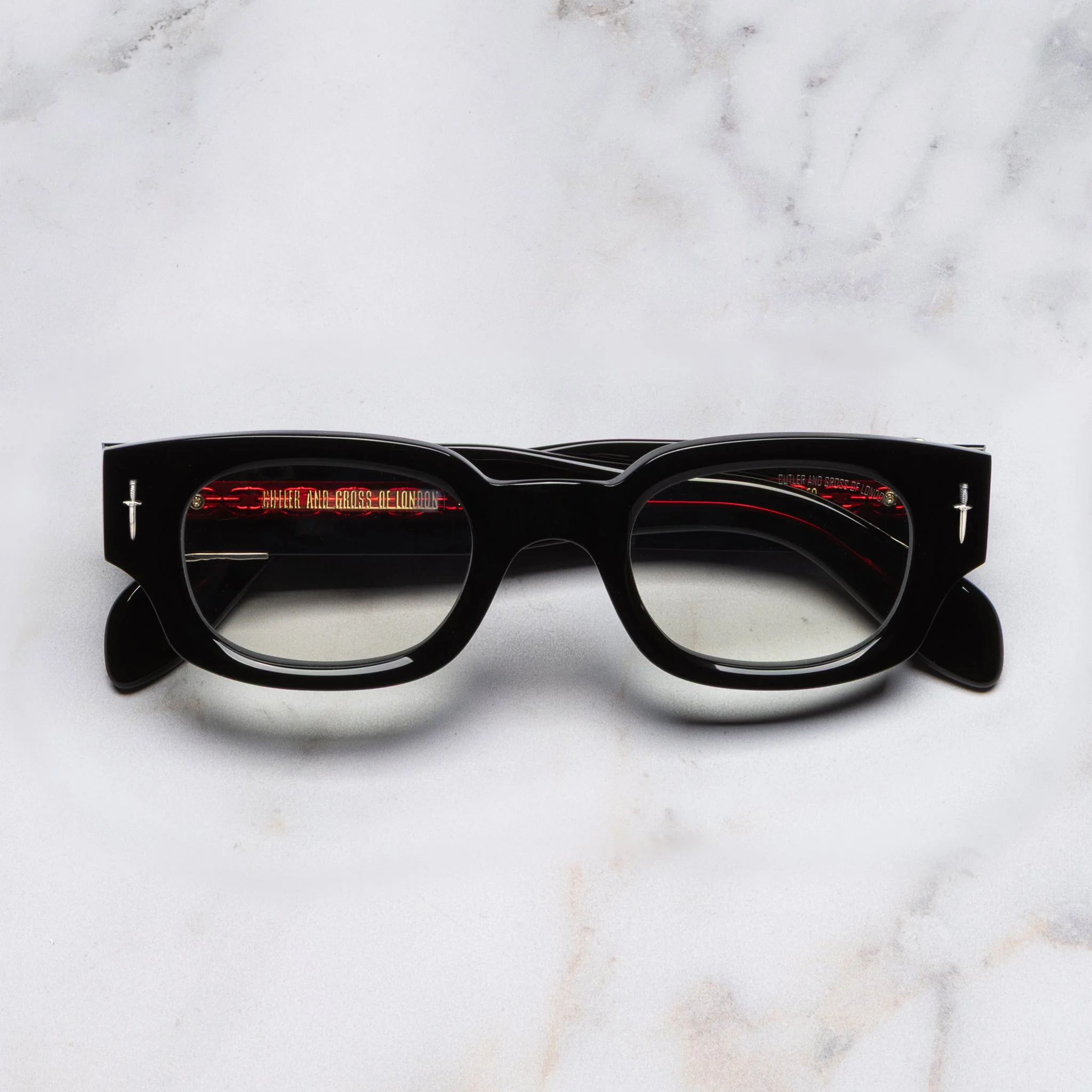 The Great Frog’s iconic metalwork reframes these square glasses with renegade roots. Hand cast from Sterling Silver, Dagger and Soaring Eagle frontal and temple pins disrupt the design. It’s crafted by hand to an old-school biker-style silhouette, and sculpted with weight-saving milling. Details - Handcrafted in Italy by expert craftspeople, read more about our craftsmanship story - Hand cast Sterling Silver Dagger frontal pins - 7-barrel hinges - Hand cast Sterling Silver Soaring Eagle temple pins - Custom Lock Down chain core wire - Gold-foil logo inside temple - Plectrum temple tips - Need help? Read our full Glossary of Terms Size & Fit SKU: GFOP-004-48-01 Frame shape: Rectangle Lens width (mm): 48 Temple length (mm): 150 Bridge width (mm): 23