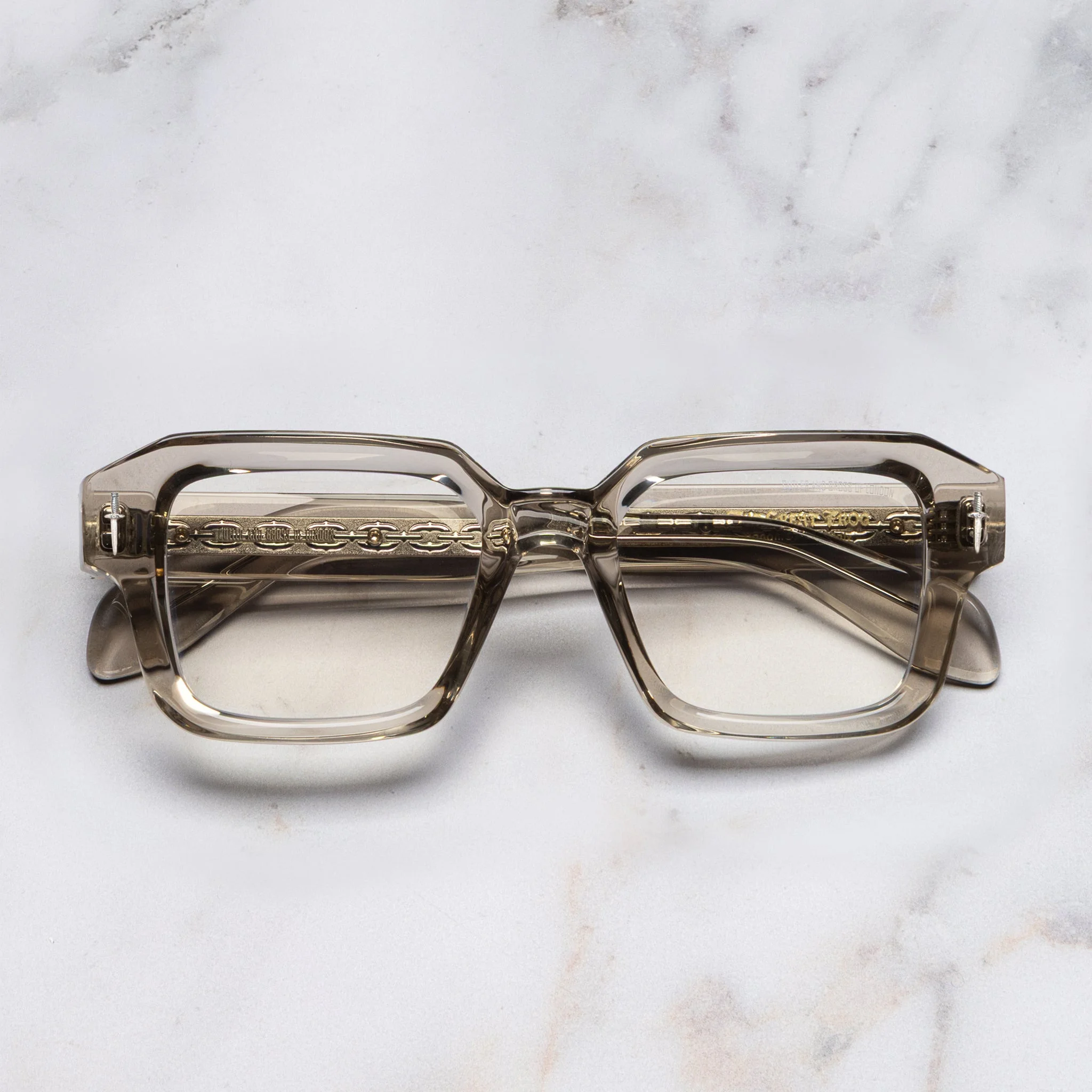 The Great Frog's rock'n'roll jewellery meets Cutler and Gross's acetate artistry with these square glasses. Hand cast in Sterling Silver, Bones Link and Dagger emblems gild the temples and frontal. The clean-cut shape is reverse-milled and threaded with Lock Down chain core wire. Details - The Great Frog Collection - Hand cast Sterling Silver Dagger frontal pins - 7-barrel hinges - Hand cast Sterling Silver Bones Link temple pins - Custom Lock Down chain core wire - Gold-foil logo inside temple - Plectrum temple tips - Handcrafted in Italy by expert craftspeople, read more about our craftsmanship story Size & Fit SKU: GFOP-005-52-04 Frame shape: Square Lens width (mm): 52 Temple length (mm): 150 Bridge width (mm): 20