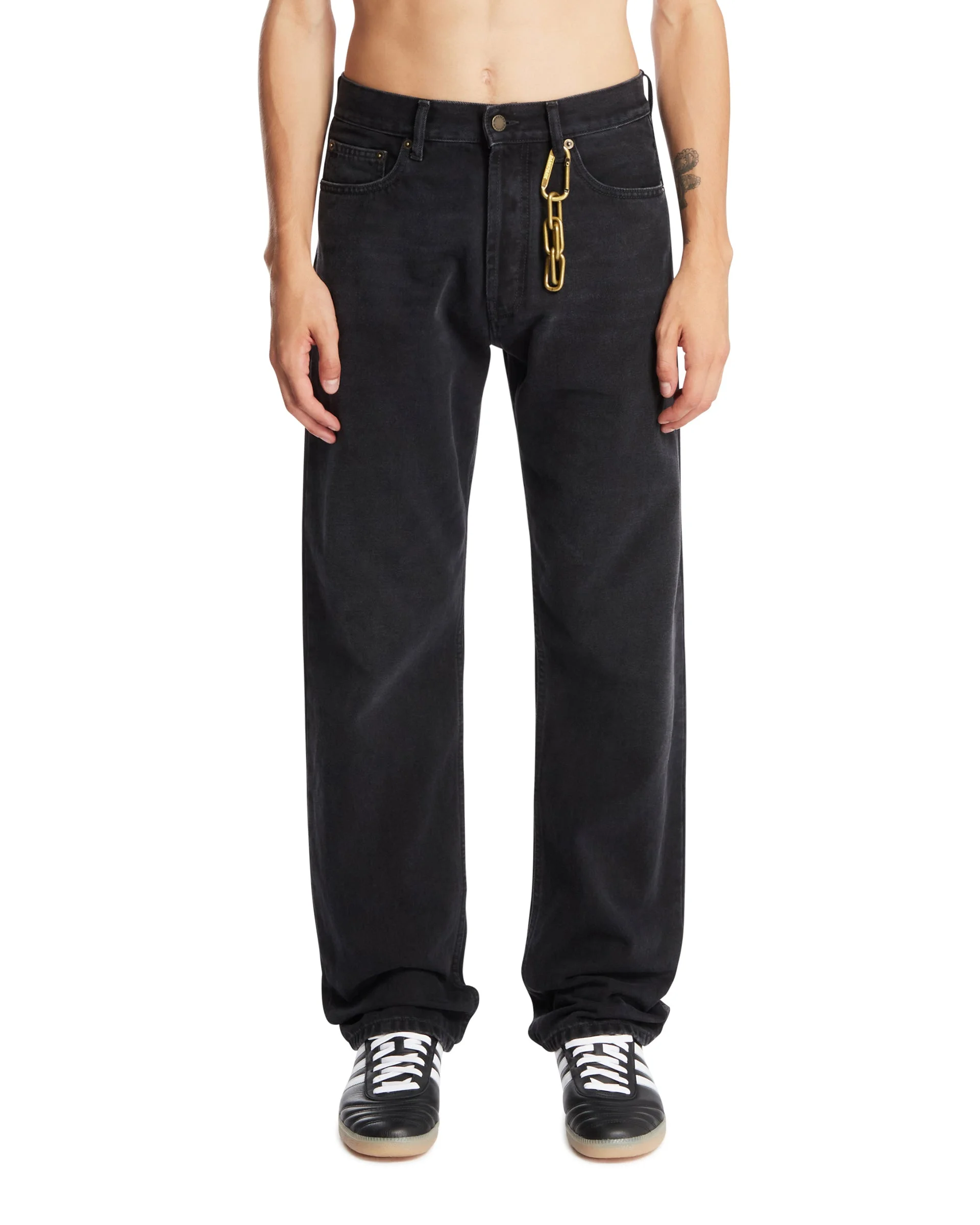 Darkpark Black Larry Straight-Leg Jeans. Black cotton, high waist, belt loops, five-pocket design, straight legs, front button and zip closure, logo label on the back, removable gold keychain with carabiner. Relaxed fit. Davide is 185 cm and he is wearing DETAILS Model: MTR03DBK01W100 Composition: 100% Cotton; Detail: 100% Brass Made in: ITALY Season: FW25-26