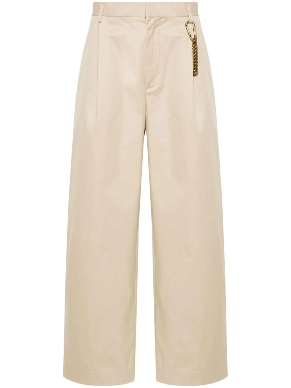pleated straight trousers Highlights - Beige - Cotton - Twill weave - Belt loops at the waist - Pleat detailing - Two side welt pockets - Removable logo-engraved hook-chain detailing - Two rear welt pockets - Internal logo tag - Straight leg - Concealed front button, hook and zip fastening Made in Italy Composition Outer: Cotton 100% Lining: Polyester 70%, Cotton 30% SIZE & FIT Model measurements Height 6 ft 2 in(1.87 m) Bust/Chest 38.18 in(97 cm) Hips 36.61 in(93 cm) Waist 29.13 in(74 cm) FittingInformation Designed for a straight-leg, allowing for an unrestricted and comfortable fit over the leg Made from a midweight non-stretch fabric This piece fits true to size – take your usual size