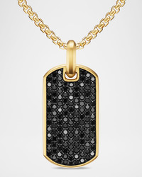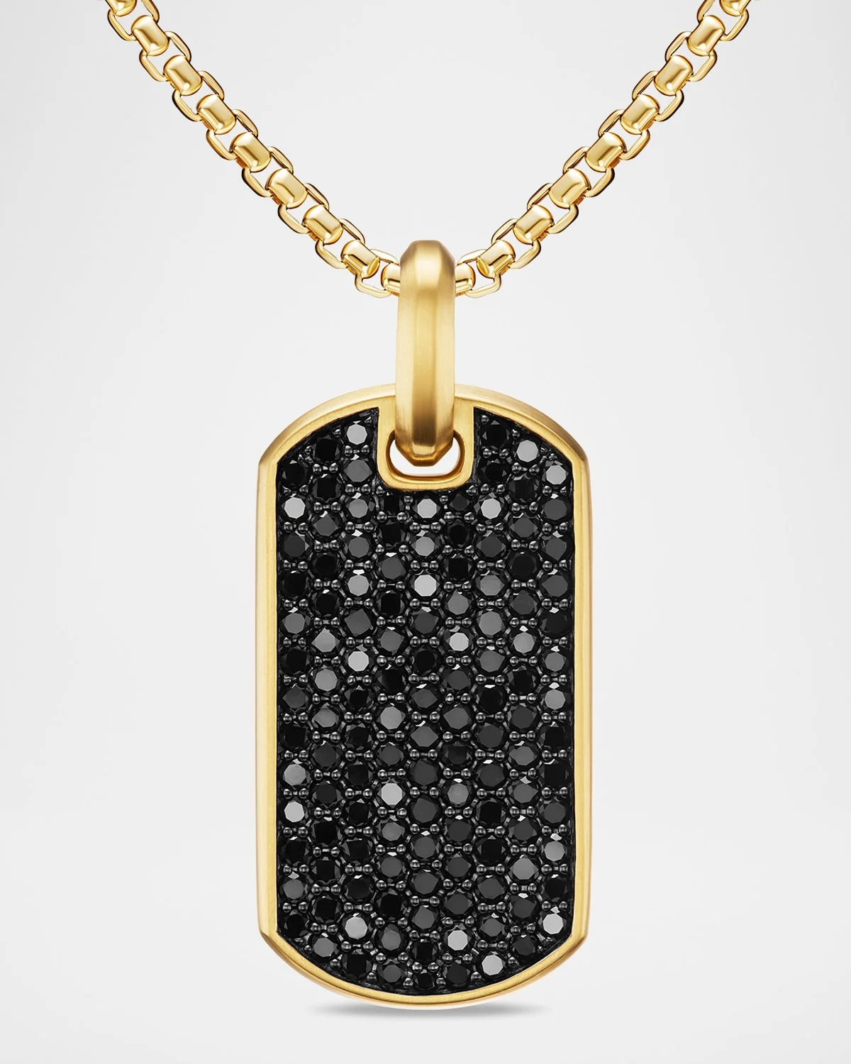 - David Yurman tag enhancer from the Chevron Collection - 18-karat yellow gold - Pave black diamonds, 3.89 total carat weight - Approx. 35 x 18.5mm - Imported - Chain sold separately - Care Instructions: - Use the provided polishing cloth to gently wipe this item clean, then remove any remaining tarnish with mild diluted soap. Rinse with warm water, dry with a clean towel and store it in its jewelry pouch. - Please note: - Styles featuring meteorite should not be exposed to water.