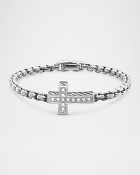 - David Yurman box chain bracelet featuring sideways cross station. - Pave diamonds, 0.48 total carat weight. - Sterling silver. - Lobster clasp. - Imported. - Care Instructions: - Use the provided polishing cloth to gently wipe this item clean, then remove any remaining tarnish with mild diluted soap. Rinse with warm water, dry with a clean towel and store it in its jewelry pouch. - Please note: - Styles featuring meteorite should not be exposed to water.