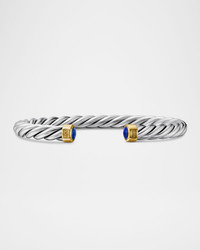David Yurman bracelet from the Cable Classic Collection. Sterling silver cable cuff. 18karat yellow gold accents. Two round lapis lazuli stones as end caps. Slipon style. Approx. 6mm wide. Made in USA of imported material.