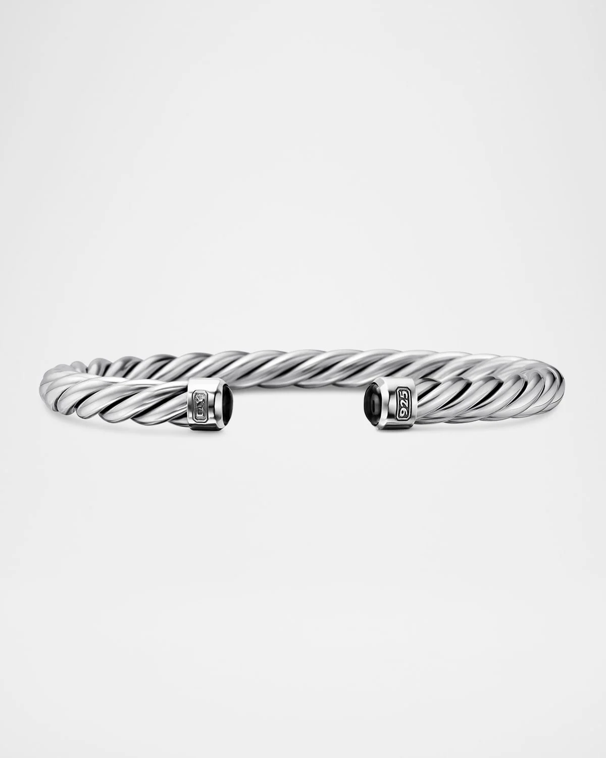 - David Yurman men's bracelet from the Cable Classics Collection. - Signature sterling silver cable cuff and settings. - Two round black onyx as end caps. - Approx. 6mm wide. - Care Instructions: - Use the provided polishing cloth to gently wipe this item clean, then remove any remaining tarnish with mild diluted soap. Rinse with warm water, dry with a clean towel and store it in its jewelry pouch. - Please note: - Styles featuring meteorite should not be exposed to water.