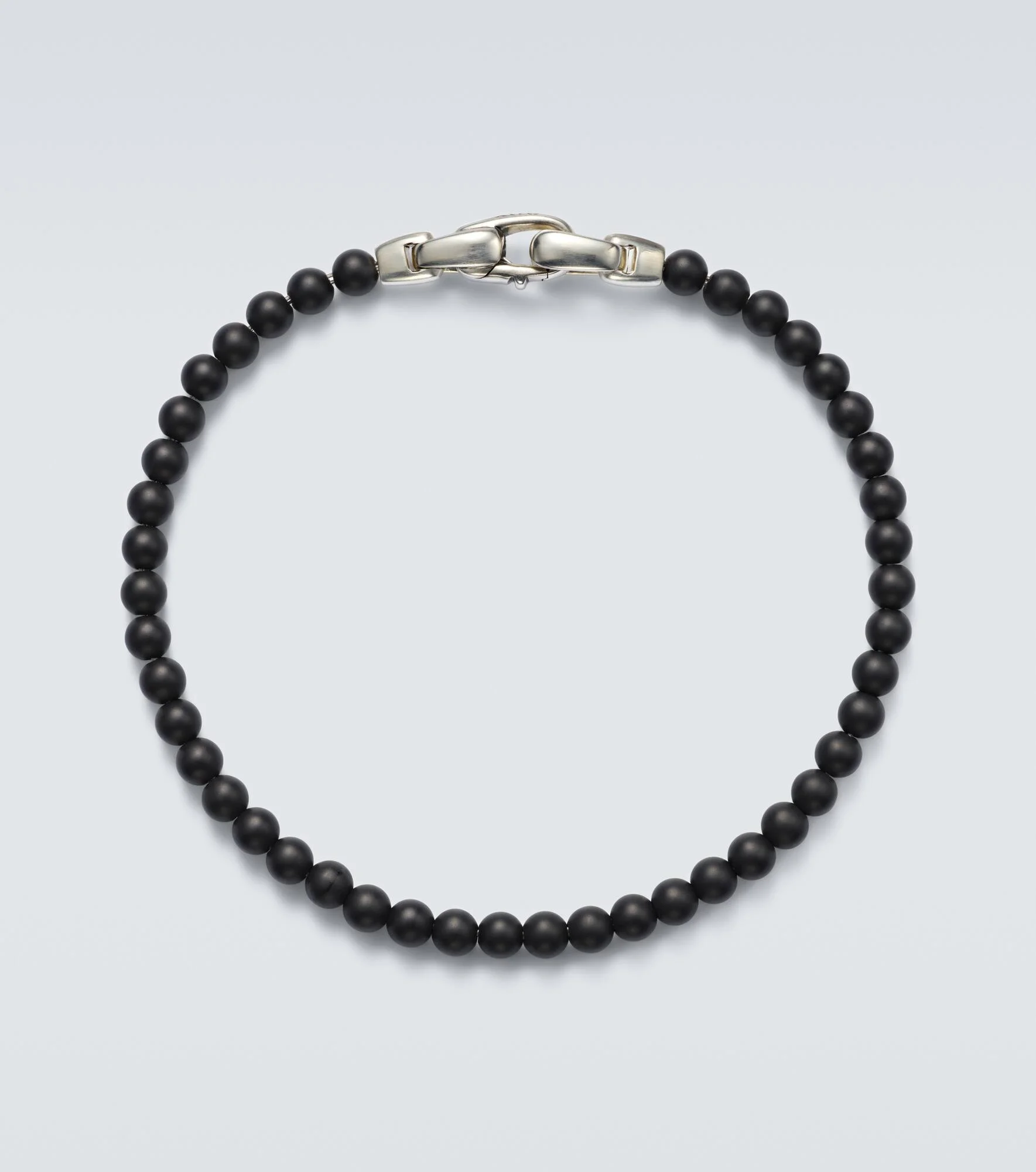 The Spiritual Beads bracelet from David Yurman is crafted with 4mm black onyx beads with sterling silver accents. Designed to be collected and layered, the piece is a timeless symbol of inner strength and authenticity. Product Details - Material: sterling silver - Made in China - Item color: black, silver - Stone I: onyx - Item number: P01090072 Size & Fit - Length when open size M 21cm-8.5" - Min. width 4mm-0.15" - Max. width 7mm-0.3"