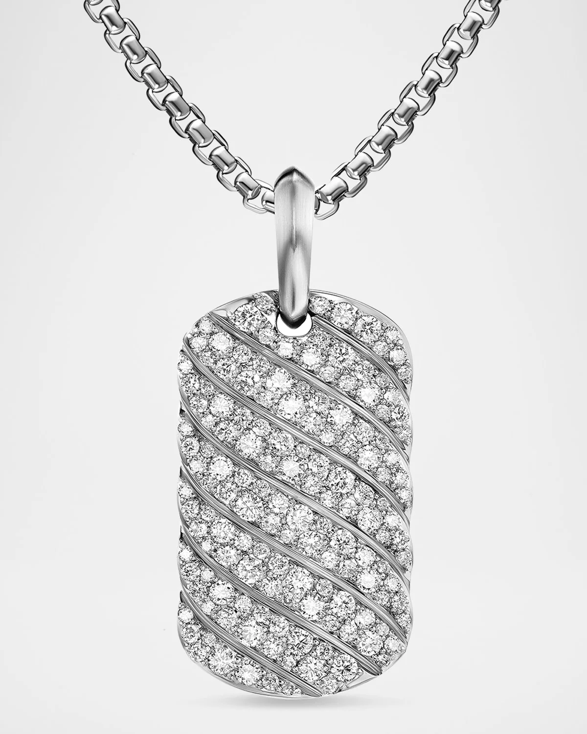 - Sterling silver - Pave-set diamonds, 3.31 total carat weight - Tag, 35 x 20.3mm - Total length, 43mm - Tag only; chain not included - Imported - Care Instructions: - Use the provided polishing cloth to gently wipe this item clean, then remove any remaining tarnish with mild diluted soap. Rinse with warm water, dry with a clean towel and store it in its jewelry pouch. - Please note: - Styles featuring meteorite should not be exposed to water.