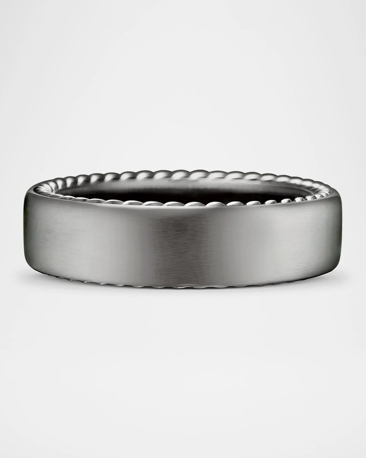- David Yurman band ring from Streamline collection. - Approx. 0.2"W (6mm). - Gray titanium/sterling silver. - Imported. - Care Instructions: - Use the provided polishing cloth to gently wipe this item clean, then remove any remaining tarnish with mild diluted soap. Rinse with warm water, dry with a clean towel and store it in its jewelry pouch. - Please note: - Styles featuring meteorite should not be exposed to water.