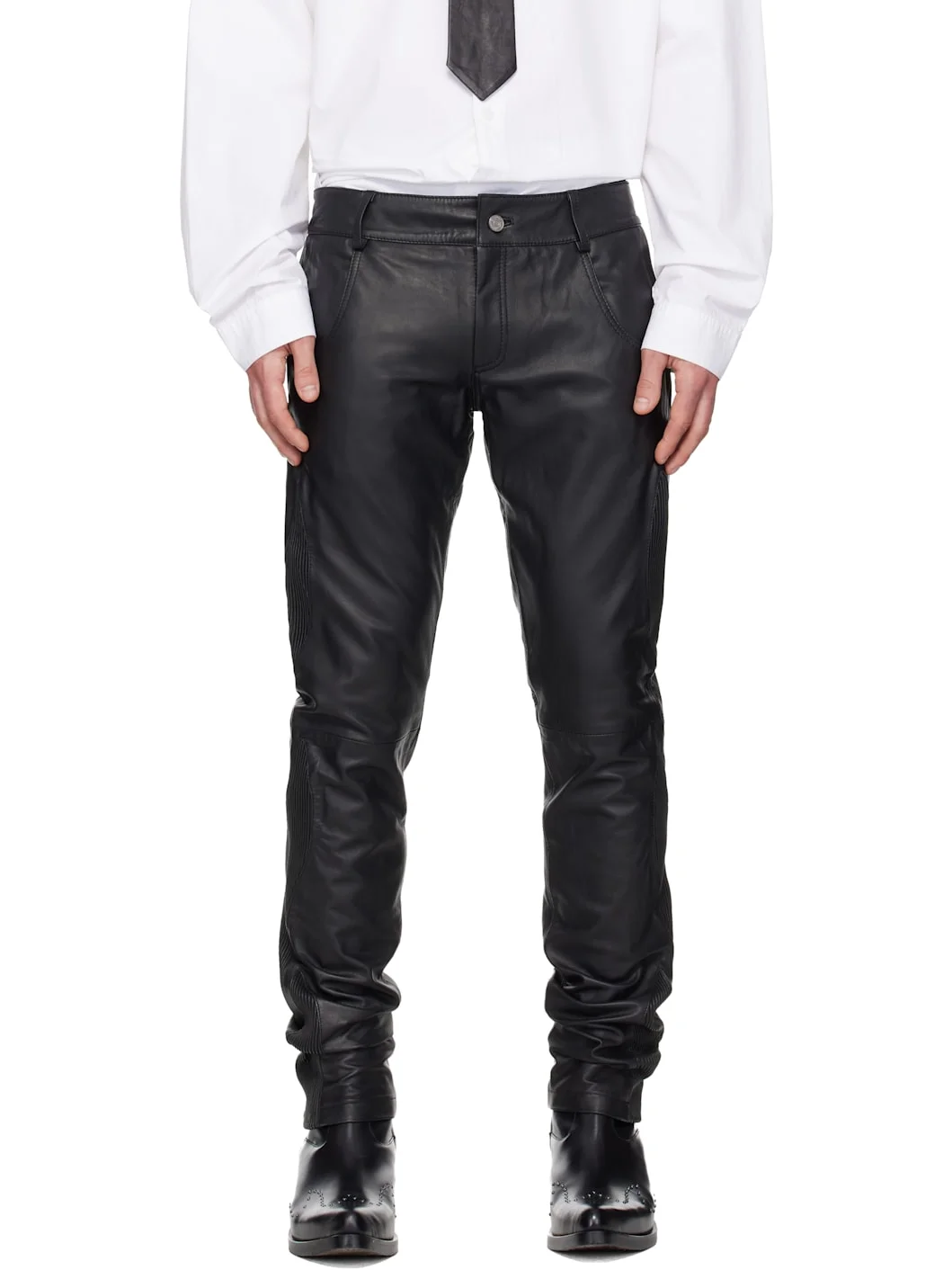 Buffed lambskin pants. · Textured panels throughout · Belt loops · Four-pocket styling · Zip fly · Full recycled satin lining Supplier color: Black Body: 100% lambskin. Lining: 100% recycled polyester. Made in India 261158M189001