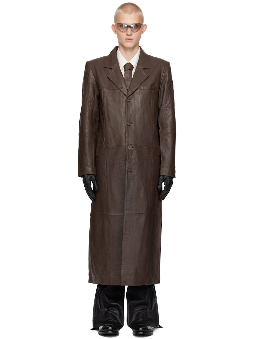 Upcycled deadstock grained lambskin coat. · Oversized · Notched lapel · Button closure · Welt pockets · Logo plaque at back · Locker loop at inner collar · Welt pocket at interior · Full recycled polyester satin lining Supplier color: Brown