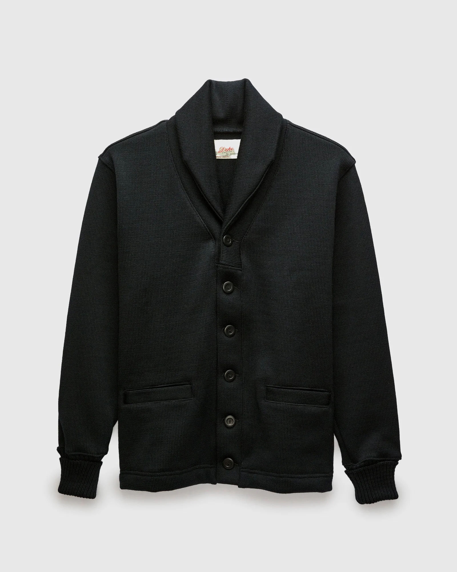 The Shawl Sweater Coat from Dehen 1920 is knit at the brand's Portland, Oregon factory using Dehen's extra heavy four-end jersey. Made using more than three pounds of 100% worsted wool yarn, this sweater is designed to withstand the test of time in both style and durability. The sweater is finished with welt pockets at the waist, interior elbow patches, fold back cuffs and custom corozo buttons. - Regular fit - Shawl collar - Extra heavy four-end jersey knit fabric - Custom corozo buttons - Interior elbow patches - Welt front pockets - Made in Portland, Oregon USA