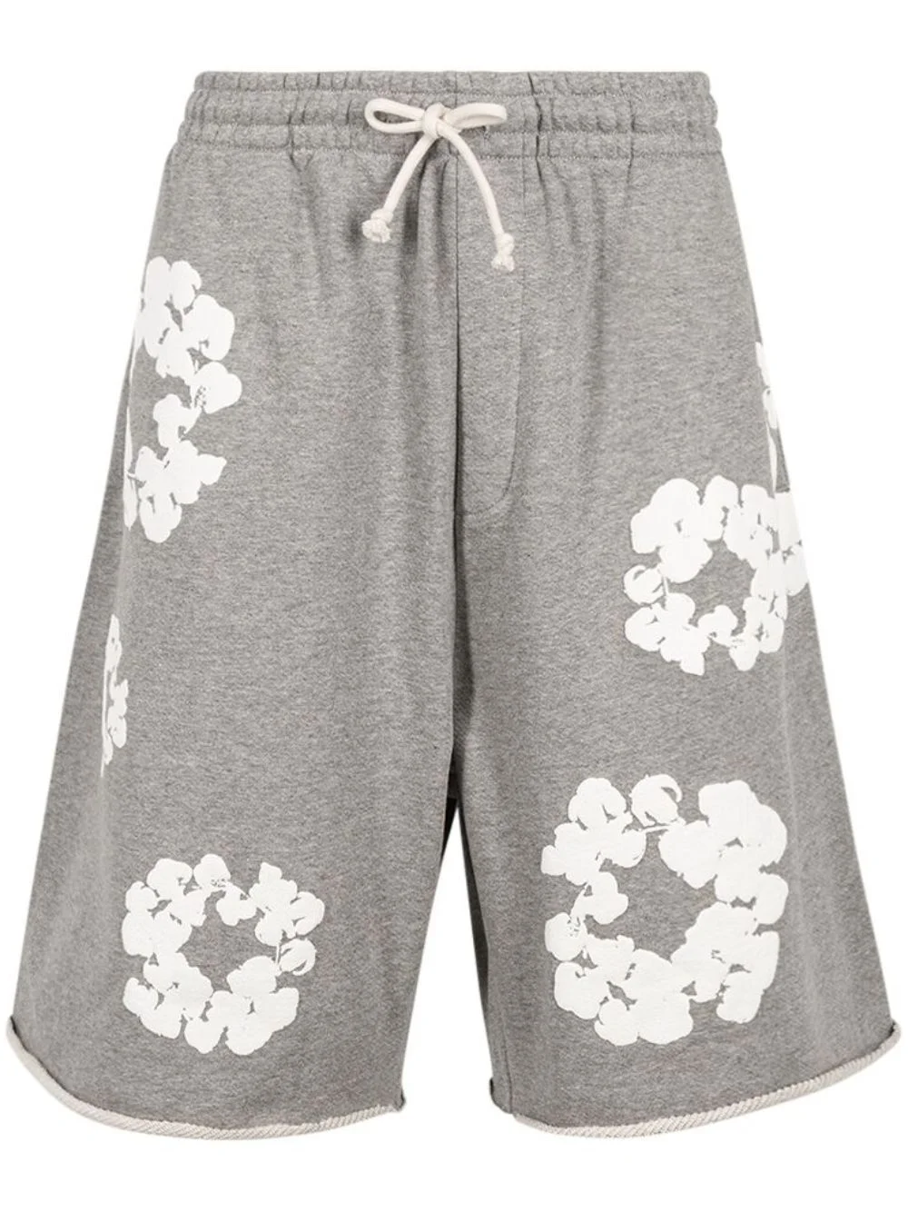 drawstring "Cotton Wreath" track shorts The Denim Tears 'Cotton Wreath' capsule collection comprises colourful, graphic-covered clothes. Meticulously crafted from premium cotton, these grey track shorts feature a tapered yet relaxed cut, accentuated by a contrast print that runs throughout. Highlights - Grey - Cotton - Abstract pattern print - Elasticated drawstring waistband - Two side inset pockets - Raw-cut hem Imported Composition Cotton 100%
