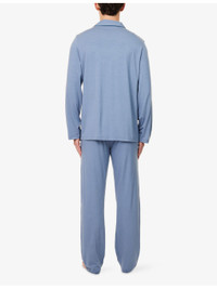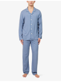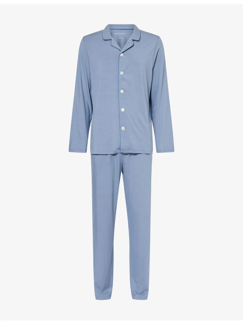 PRODUCT DETAILS - Derek Rose jersey pyjamas set - 95% modal, 5% elastane - Button fastening - Top: exposed button fastenings at front, relaxed fit, camp collar, long sleeves, dropped shoulders - Bottoms: relaxed fit, mid-rise, elasticated waistband, straight leg - Machine wash at 30°C - Model is 6ft 2in/1.88m and wears a size medium - Lightweight, stretchy Ref: R04547224