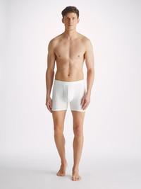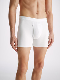 Our Alex trunks in white are cut for a streamlined, classic look with a fitted shape, classic open front and a longer leg. A fabric-covered waistband provides gentle skin contact. Crafted from a lighter weight version of our best-selling Basel fabric, combining a blend of 94% micro modal and 6% elastane for exceptional softness and comfort. Not only is the Alex soft, but thermostatic properties in the micro modal fibres allow them to react to changes in temperature and regulate your body heat. What's more, the fabric is also environmentally friendly, made from European beech tree pulp. The model is 6' 1 " / 18 5 cm tall with waist size 3 1 ” / 79 cm, chest size 38 ” / 9 6 cm. He wears a size Medium . PRODUCT DETAILS Material: Micro Modal Stretch Fabric Weight: Light Fabric Type: Jersey Gender: Men's Colour: White Pattern: Plain Season: CLA Country of Origin: Albania Composition: 94% Modal 6% Elastane Fit: Regular Fit Item Number: 8547-ALEX001WHI
